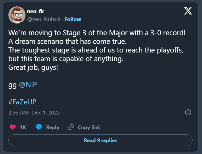 虎扑12月01日讯在FaZeClan于布达佩斯Major第二阶段以三战全胜的战绩强势晋级后,队内教练见NEO在社交媒体上发文,表达了激动之情,同时也保持了冷静的头脑。