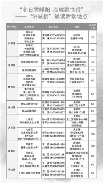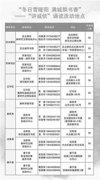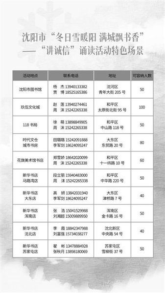 12月的每周三,沈阳发布客户端将会发布当周周末各诵读场所开展“冬日雪暖阳满城飘书香”——“讲诚信”诵读活动分享会的具体时间,敬请关注。
