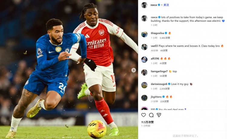 詹姆斯也在赛后通过社媒晒出自己同埃泽的对位照,并配文:“今天的比赛有很多积极的方面值得总结。我们会继续进步。感谢大家的支持,今天下午真是太棒了!”