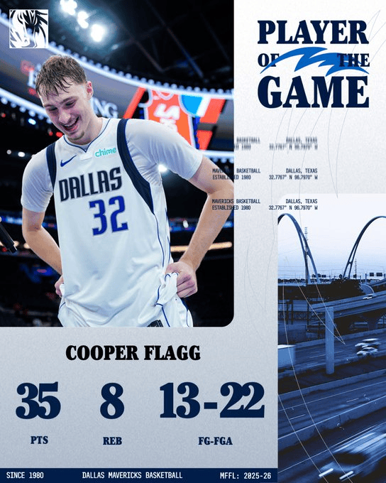 本场比赛,独行侠球员库珀-弗拉格出战37分钟,22投13中,其中三分球3投0中,罚球11投9中,得到35分8篮板2助攻。