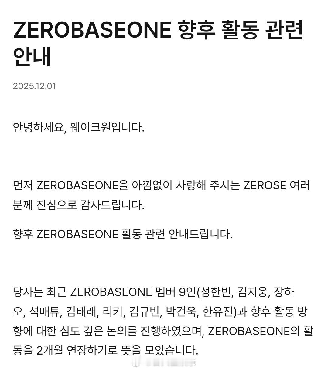 ZB1组合官方发文称所有成员合约将延期两个月ZB1组合合约延期两个月ZB1成员合约延期两个月