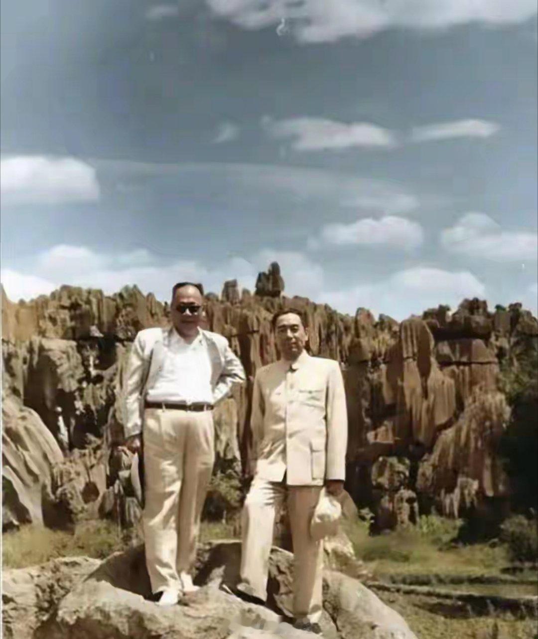 六十年代周总理与陈毅访问回国,来到云南,漫步在石林,合影留念