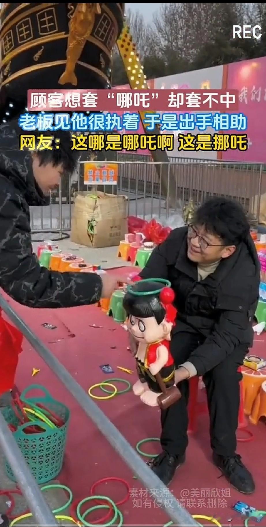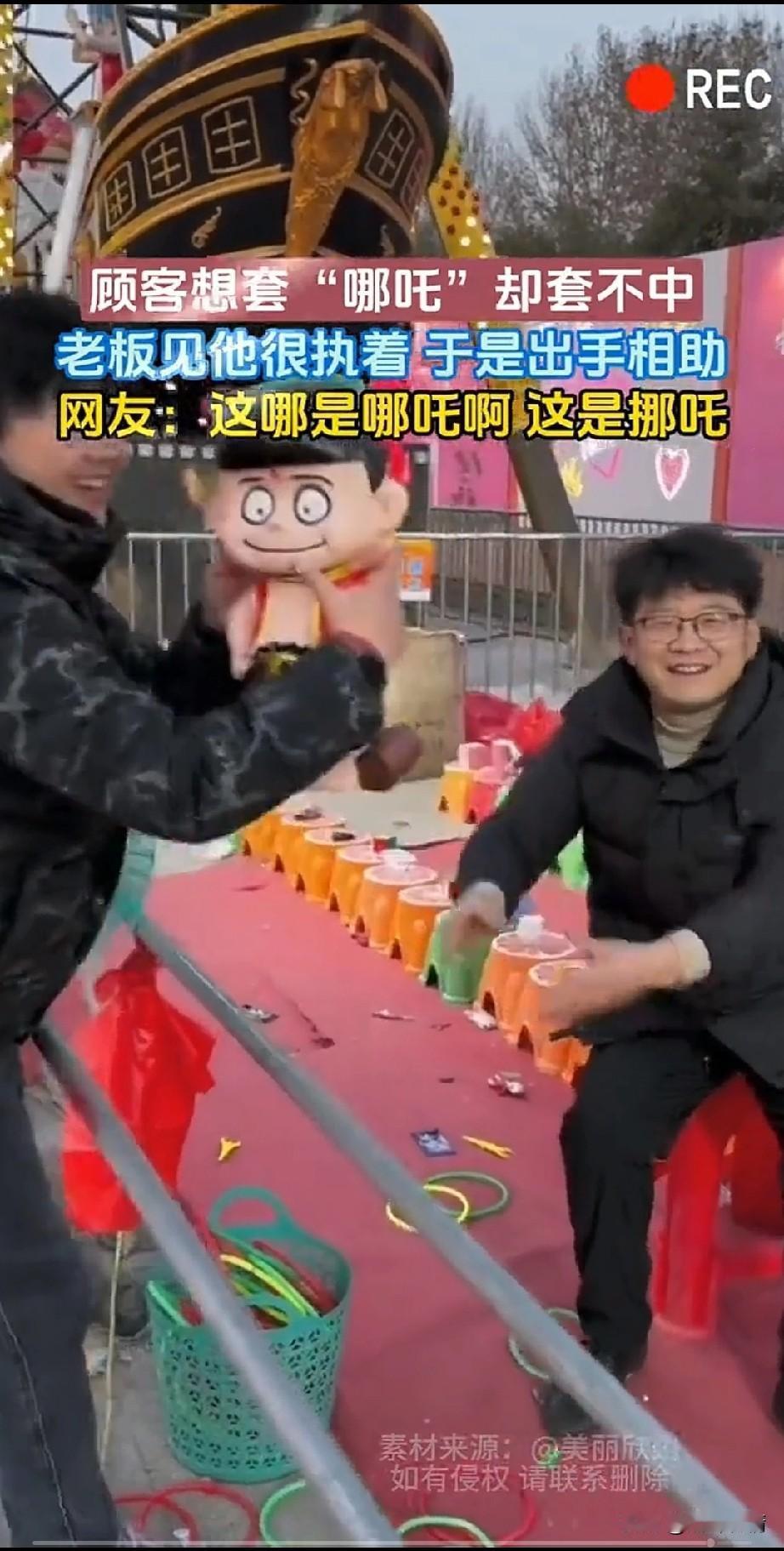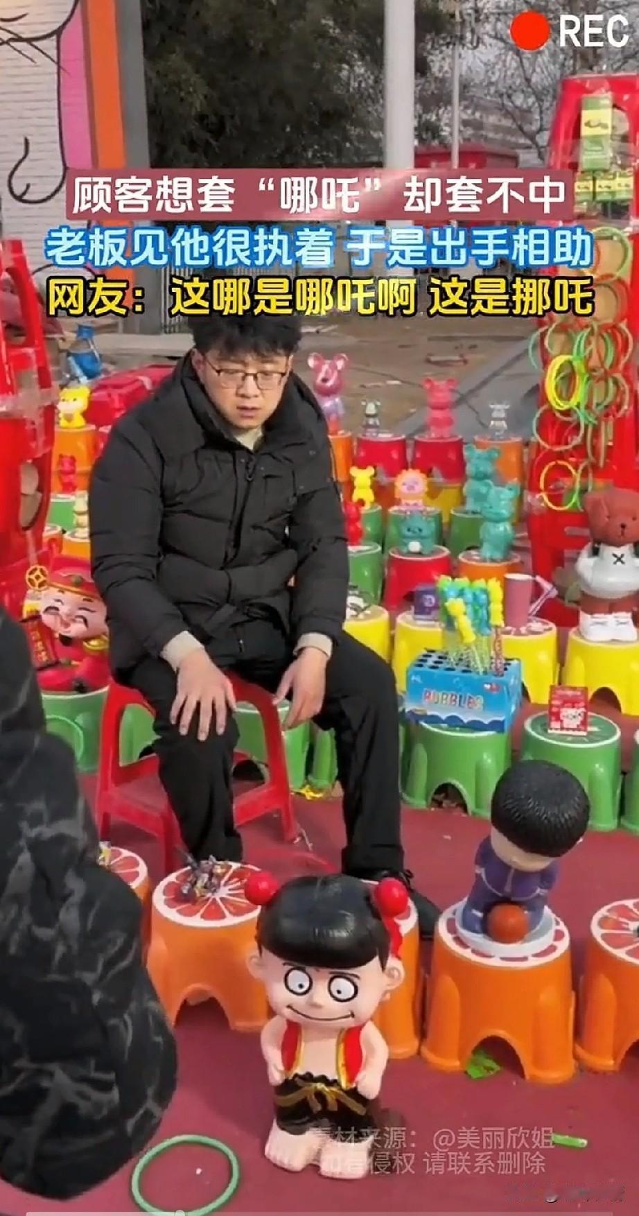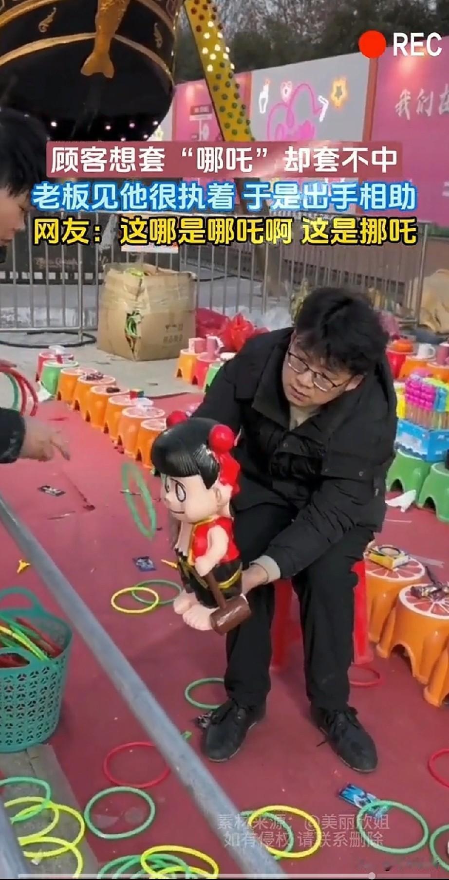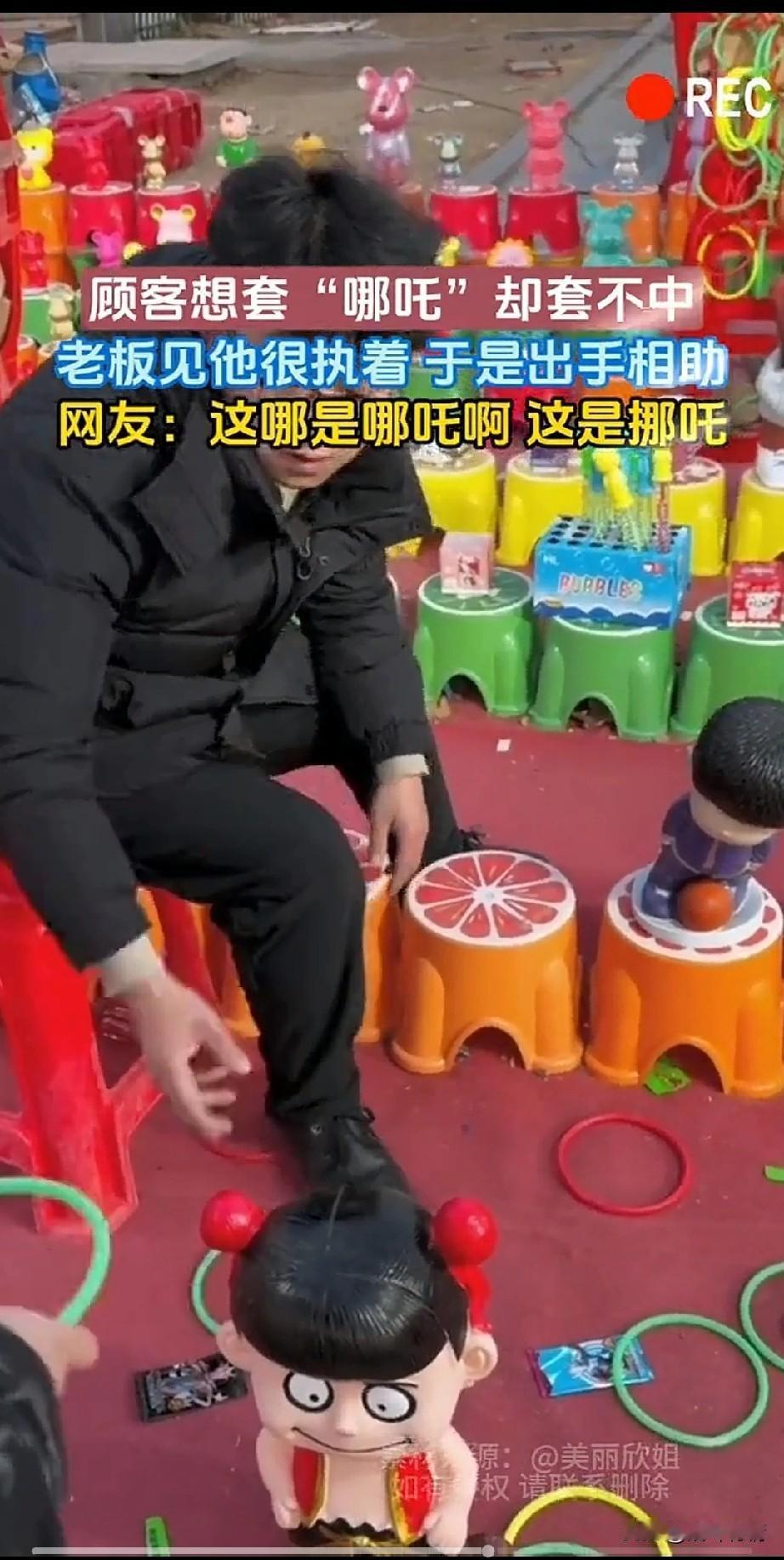 大哥摆摊套圈, 没想到遇到了个倔强的女子, 买了很多人圈, 别的都不套, 只套那个哪吒, 扔了几十个圈, 愣是套不住, 老板看到姑娘这么执着, 于是决定放水, 拿起哪吒往女子的方向拿了过去, 想着这样总可以了吧, 没想到又是20个圈下去吧, 还是没有套住, 老板很是无奈, 只能再次把哪吒靠近女孩, 结果没想到女孩依旧不争气, 老板不装了, 直接双手拿起了哪吒, 然后还去套圈, 结果在几个圈下去之后, 终于有一个勉强套上了, 老板也是松了一口气, 把哪吒给了这个女孩, 心理肯定想, 终于打发走这个犟种了, 要不然多影响生意。 大家对于套圈犟女孩怎么看? 套圈摊 套圈玩法 套圈绝技 套圈活物 套圈摊主 套圈夜市