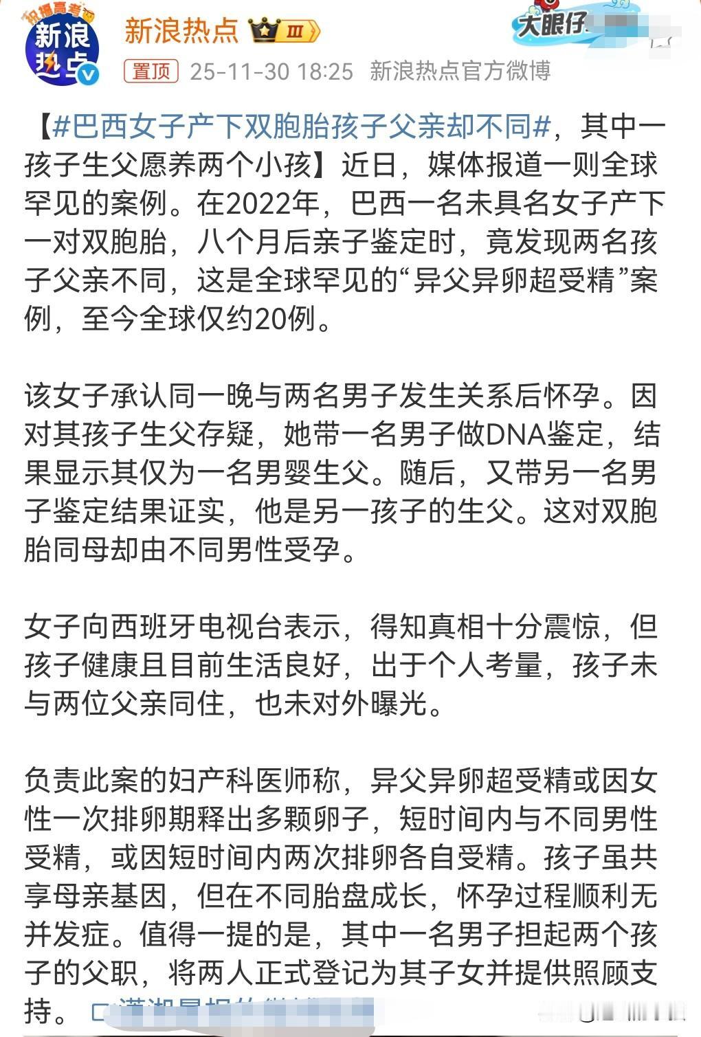 奇怪的知识又增加了,这巴西女人真的是太花心了,同一天和不同的男人发生关系,结果生下了双胞胎,双胞胎的父亲不是同一人。 这也是非常的罕见啊。 双胞胎竟然不是一个父亲所生。 这可如何是好? 其中一个父亲说愿意养两个孩子,这人还蛮好的,不介意当背锅侠。