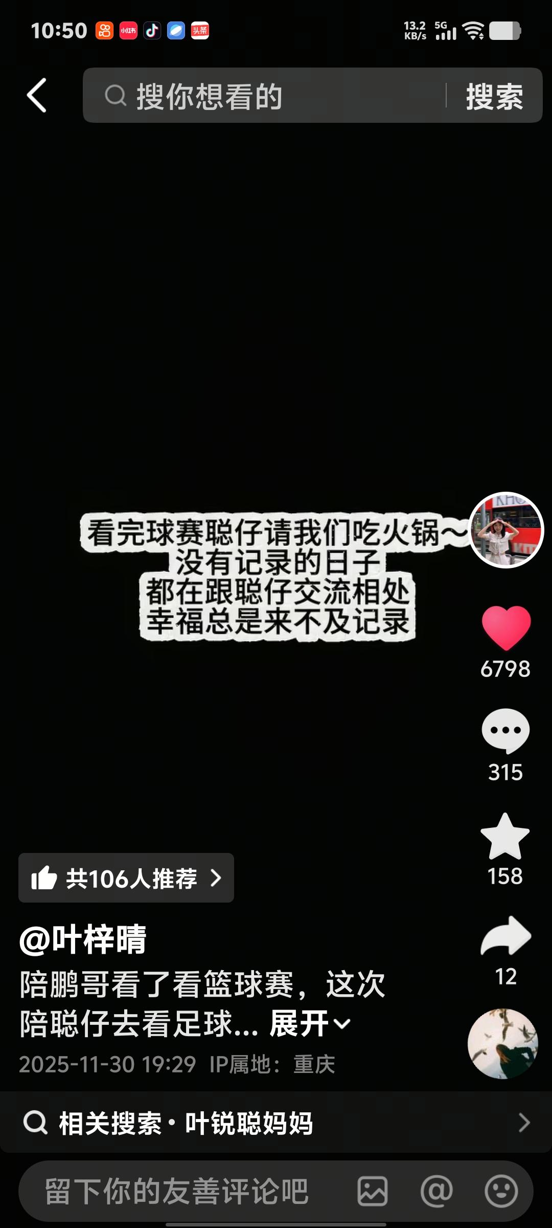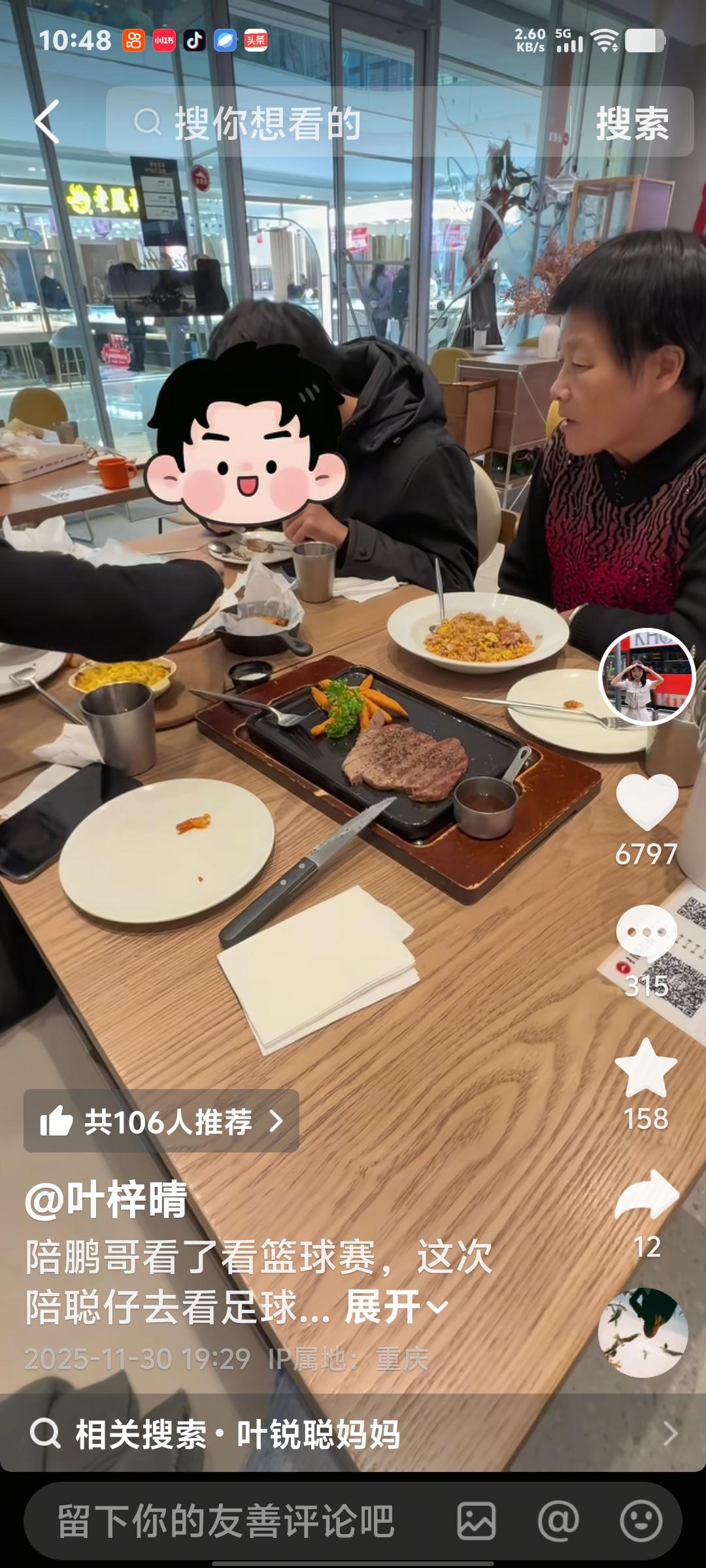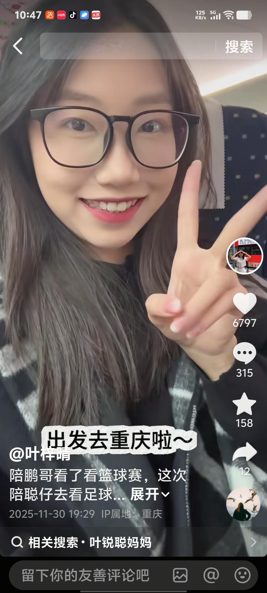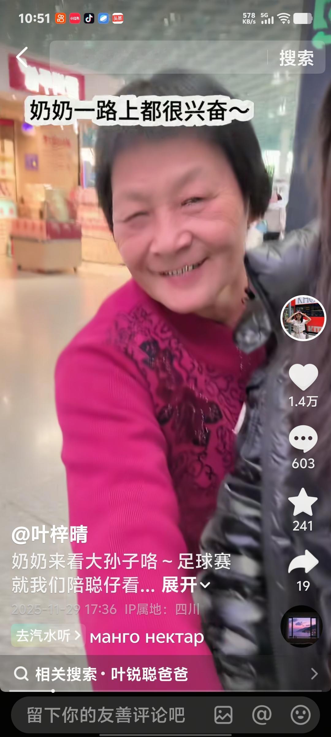 叶锐聪赴渝为国足打call!姐姐大姨护航+奶奶首飞相伴,火锅局超有爱❤️ 叶瑞聪喜欢足球。姐姐特意陪她坐飞机去重庆看足球,支持国足。还有大姨陪着给聪聪买了好多衣服。 到了重庆第一件事儿就是吃火锅。一行三人吃的好开心。聪聪和姐姐在一起,大大方方。 奶奶也陪着孙子孙女过来了。年纪这么大,真的很辛苦,但是奶奶很开心能陪大孙子。累也快乐着。 吃饭的时候生怕聪聪吃不饱,奶奶坐旁边看着。硬是让孩子多吃了一碗饭。 奶奶这次是第一次坐飞机陪着大孙子,显得很兴奋,聪聪很喜欢运动,本人也爱踢足球。 回归原生家庭真好。一切都这么自然,这么幸福。