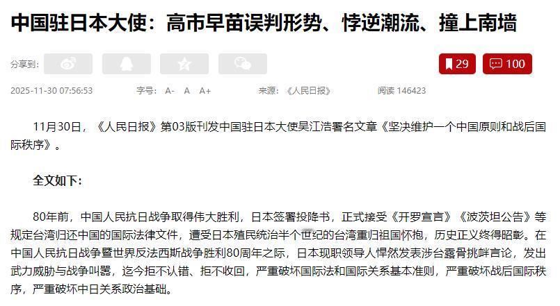中国大使正告日本,必须撤回谬论!   11月30日,中国驻日大使吴江浩通过官方渠道发文,态度鲜明地表明了中方立场:对于这种荒谬言论,我们绝不会“轻轻放下”。日方当前唯一的正确选择,就是立刻收回这些错误言论,严格遵守曾经作出的政治承诺,停止一切破坏战后国际秩序的倒行逆施。   事实上,在此之前,外交部副部长已召见日本驻华大使严正交涉,国防部、国台办也纷纷发声,14亿中国人民的态度空前一致,绝不允许任何外部势力染指台湾问题。   而作为日本现任首相的高市早苗,上月初在日本部的国会答辩中抛出涉台错误言论,公然将“台湾有事”与日本“存亡危机事态”挂钩,暗示日本自卫队可能因此行使集体自卫权,这是日本在任首相首次明确声称要武力介入台海局势,无疑是踩着中日关系的红线肆意妄为。   值得警惕的是,这并非她一时兴起的妄言,此前她就曾窜台与“台独”分子会面,鼓噪日台建立“准安全联盟”,甚至在与台湾地区相关人员视频时并排悬挂不当旗帜,其干涉中国内政的野心昭然若揭。   面对这种突破底线的行径,我们的台独强硬起来也是理所应当的,而最近一系列的外交动向也早已释放出了明确的信号。   这段时间,我们反复提及日本和平宪法中的“敌国条款”,就是要提醒日方,其扩军备战、干涉他国内政的行为,早已违背了战后和平发展的初衷。   同时,我们还在联合国重新提及琉球问题。历史上琉球曾是中国藩属国,日本当年以武力侵占琉球并无合法依据,《开罗宣言》和《波茨坦公告》也明确规定日本需放弃侵略所得土地,中方提及此事,正是基于历史法理的正当发声。   我们还与联合国安理会各常任理事国保持密切沟通,争取到了全世界各国广泛的理解与支持。   反观日本的那些西方盟友,面对高市早苗的极端言论,却集体选择了沉默,显然没人愿意为日本的冒险行为背书。   最具戏剧性的是,美国总统特朗普特意给高市早苗打去电话,明确要求她在台海问题上“降调”,不要激怒中方。这通电话足以说明,连日本寄予厚望的盟友都清楚,这种挑衅行为风险极高,不愿被其拖入泥潭。   日本国内其实也不乏理性声音,前首相鸠山由纪夫直言台湾问题是中国内政,日本不应插手,多家日本媒体也批评高市早苗的言论可能引发战争风险。只是支持她的声音更大,这些理智的声音目前还不能让她转向!   今年是中国人民抗日战争暨世界反法西斯战争胜利80周年,也是台湾光复80周年,历史的教训历历在目,任何妄图重蹈军国主义覆辙的行为,都必将遭到惨败。