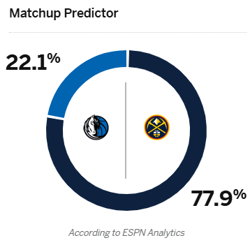 ESPN预测明日比赛:掘金胜率77.9%,独行侠胜率22.1%