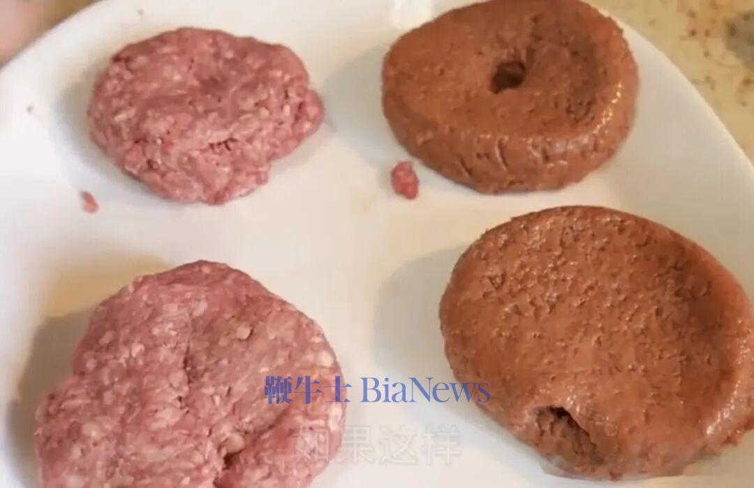 图片显示,左边为真肉饼,色泽呈现出鲜红色。而右边的人造肉,看上去颜色要比真肉深,甚至有些偏棕色。