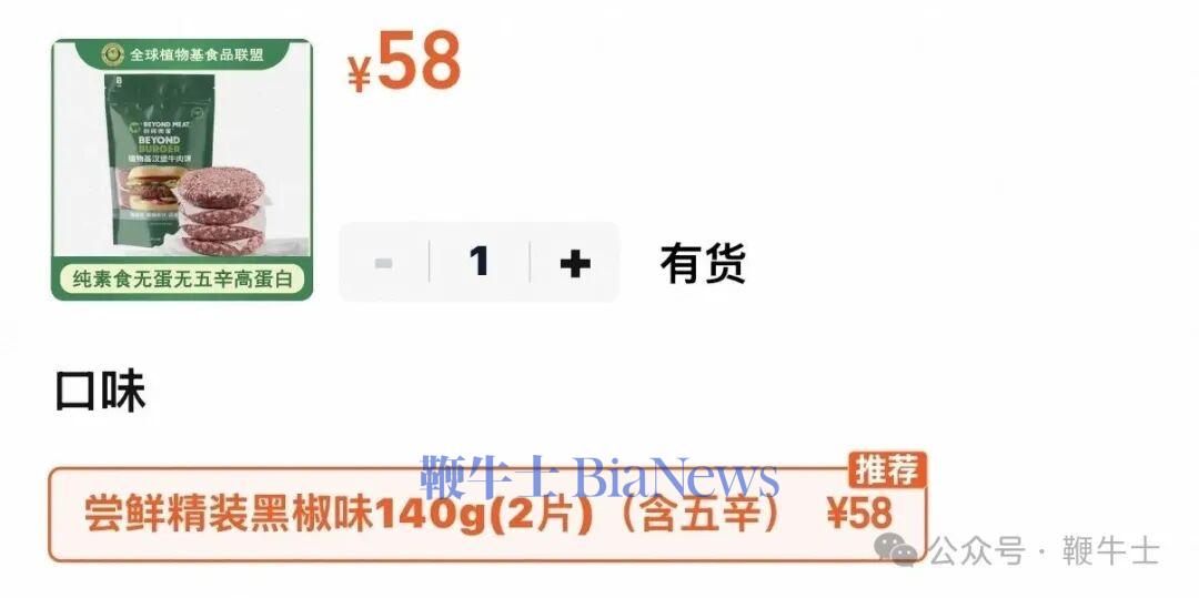 笔者经查询,某电商平台售卖的别样肉客“植物基汉堡牛肉饼”140g(2片),售价58元,也就是说,一片70g,29元。