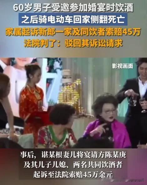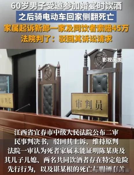 江西高安婚宴饮酒后骑车身亡索赔案,二审维持驳回原判 2025年11月21日,宜春市中级人民法院对这起婚宴后意外离世索赔案作出二审判决,驳回死者谌某根妻儿的上诉,维持一审原判,陈某庚一家及两名共同饮酒者无需承担赔偿责任 。案件详情及判决理由如下 : 1. 宴席无劝酒,散席时当事人状态正常:2023年10月4日,陈某庚为儿子儿媳办婚礼,邀请战友谌某根等人赴宴。席间宾客可自愿选饮酒水,谌某根与另外两人自行倒酒饮用,他本人喝了约二两53度白酒,且全程无人劝酒。陈某庚敬酒时喝的是水,也未对谌某根加酒劝酒。散席后,谌某根还能正常与战友步行一段路,无任何醉酒或身体不适的迹象。 2. 返程出意外,死因无法明确:当日13时30分左右,谌某根骑行电动车返程途中侧翻,最终抢救无效死亡。司法鉴定显示其血液酒精含量为22.17mg/100mL,未达醉驾标准,且仅靠尸表检验没法确定死亡原因。交警曾建议尸检进一步查明死因,但遭到其家属拒绝。 3. 法院两审均驳回索赔:一审法院指出,宴请方和同饮者承担责任的前提,通常是存在劝酒、斗酒等危险先行行为。而谌某根妻儿既拿不出证据,证明陈某庚等人有这类行为,也无法证实死亡与饮酒存在关联。依据《民事诉讼法》,他们要承担举证不能的后果。谌某根妻儿不服上诉后,二审法院认可一审的审理逻辑,最终驳回上诉,维持了原判。 此案明确了共同饮酒的责任边界,若不存在强制劝酒等过错行为,且无法证明饮酒与损害结果有直接关联,不能单纯以共同饮酒为由要求他人担责,这也为类似纠纷提供了清晰的法律指引 。喝酒死亡赔偿 拼酒致死赔偿