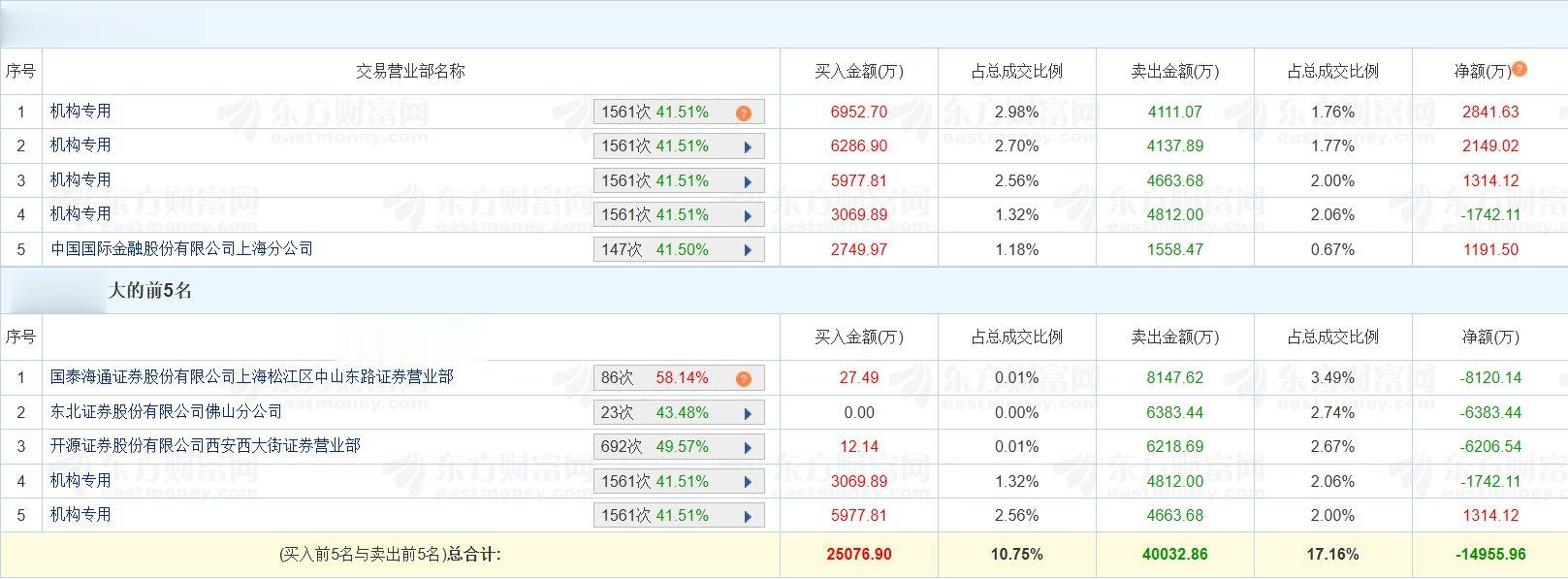 东田微(301183.SZ)今日创历史新高迅速转跌,最终收跌2%,换手率32.29%,成交额23.32亿元。龙虎榜数据显示,四家机构买入2.23亿元,卖出1.77亿元,净买入4563万元;游资“中山东路”位列卖一席位,净卖出8120万元;“量化打板”位列卖三席位,净卖出6207万元。上榜席位合计净卖出1.5亿元。(格隆汇)