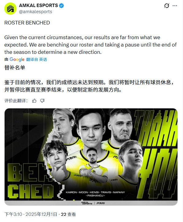 虎扑12月01日讯AMKAL电子竞技俱乐部官宣将目前的阵容下放替补席,并寻求新的发展方向。这意味着nafany、KaiR0N-、KENSI等人将暂时失业。