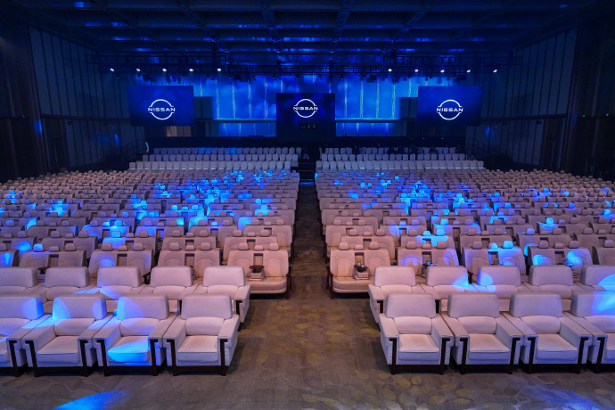 东风日产 N6 的发布会现场摆着几百张双人沙发,现场直接从新车发布会切成宜家家居