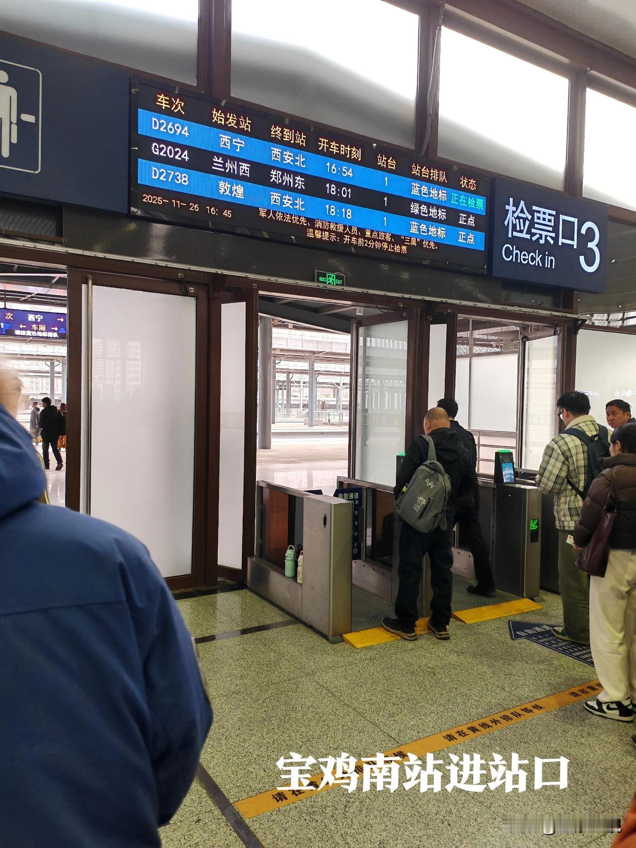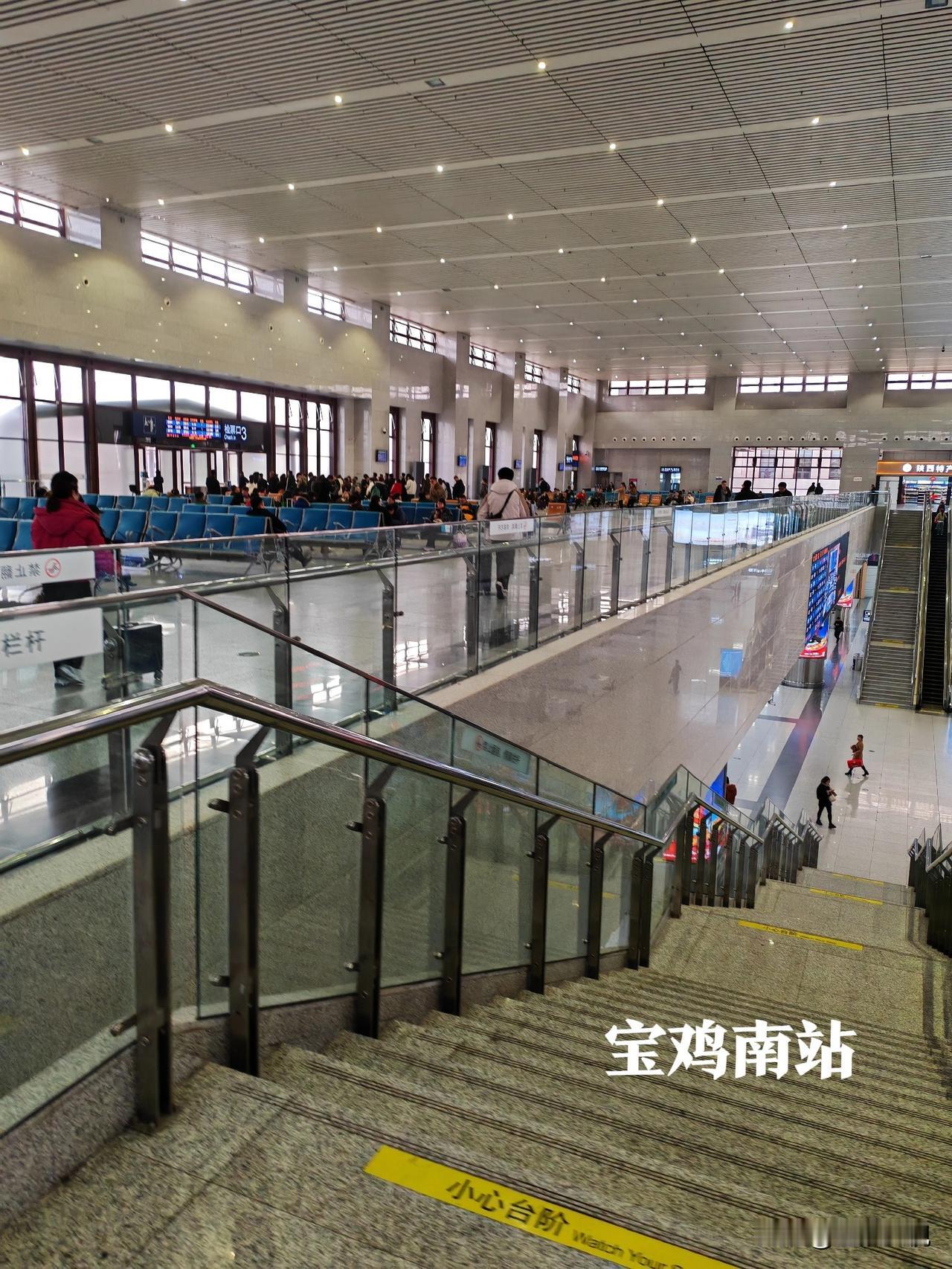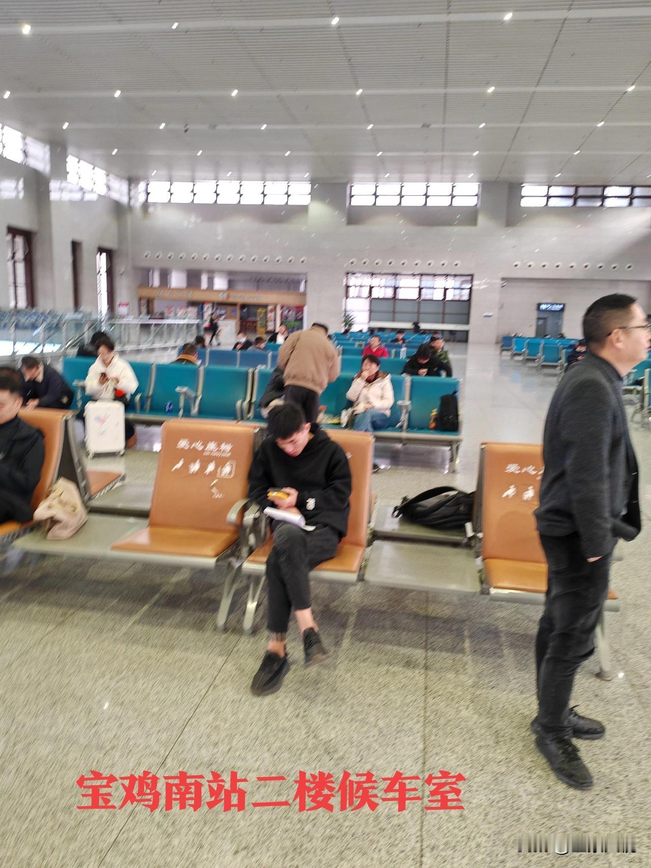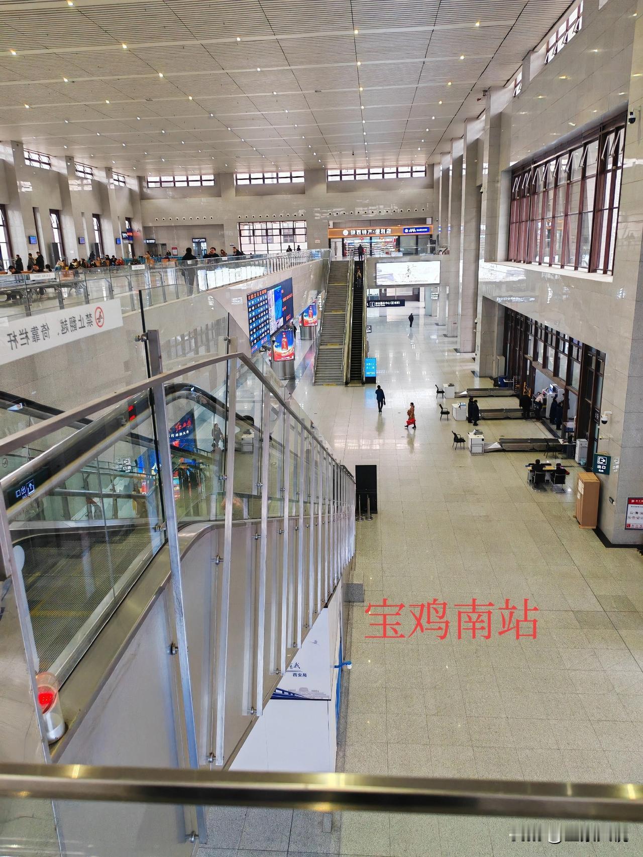 天水与宝鸡不愧为两个兄弟城市,就连高铁站都像孪生兄弟! 经常坐高铁往返于西安天水区间,但从来没有去过宝鸡南站里面,今天从天水南站去西安北,车票紧张买了个在宝鸡南换乘的票,到宝鸡南站里面一看,建筑风格与天水南站大同小异,都是从北面正门安检进入候车室,候车室也是上下两层,东西两头电梯上楼。区别就是宝鸡的候车空间大,座位少,旅客少,进站检票口略小,候车室周围店铺少,商业氛围不强,但线站多达14线8站台。而天水南站候车室相对空间小,座位多,旅客多拥挤,进站检票口大一点,只有9线5站台。 友友们觉得天水南站与宝鸡南站两个高铁站的候车室里面的格局和站台像不像?
