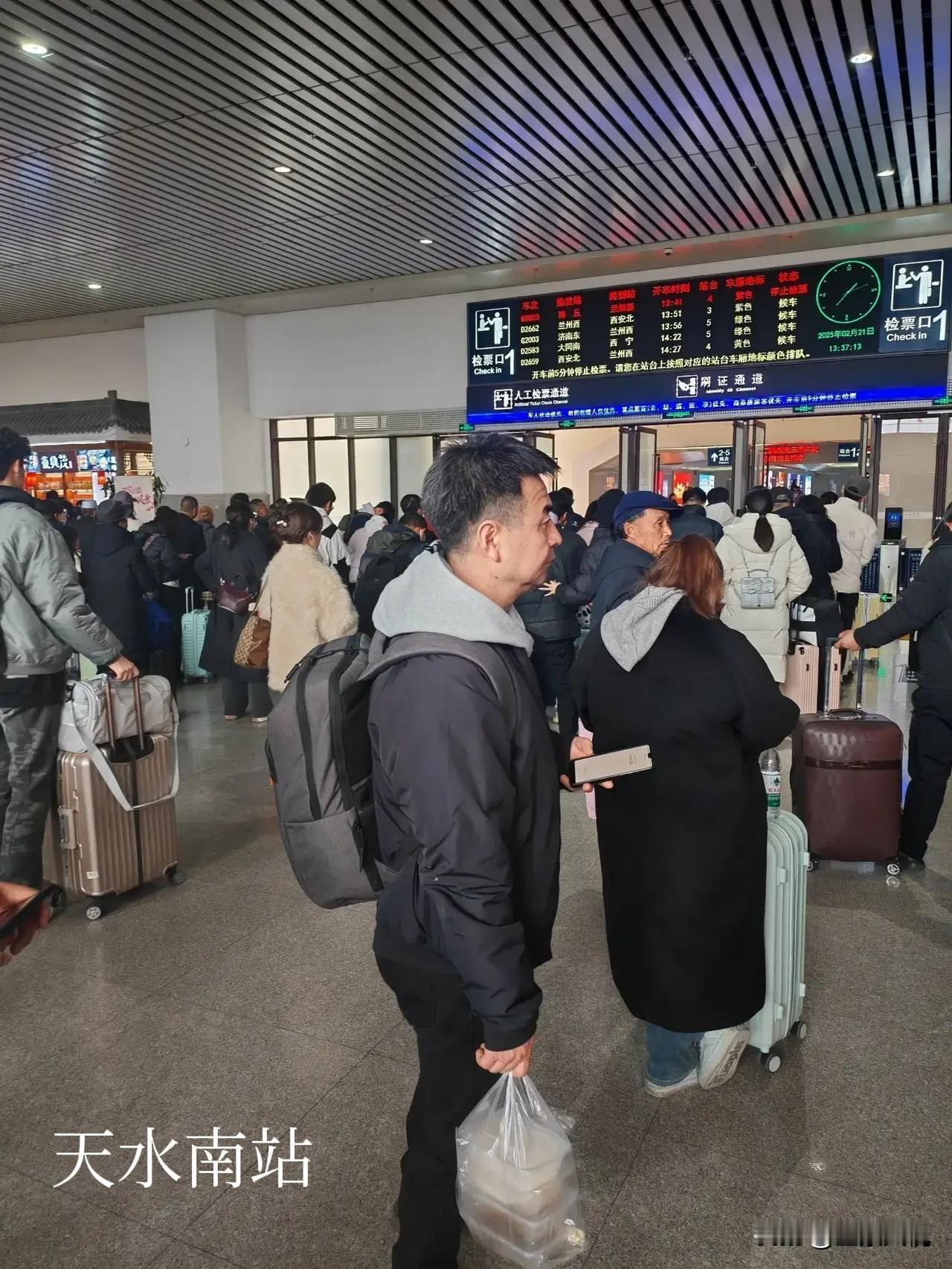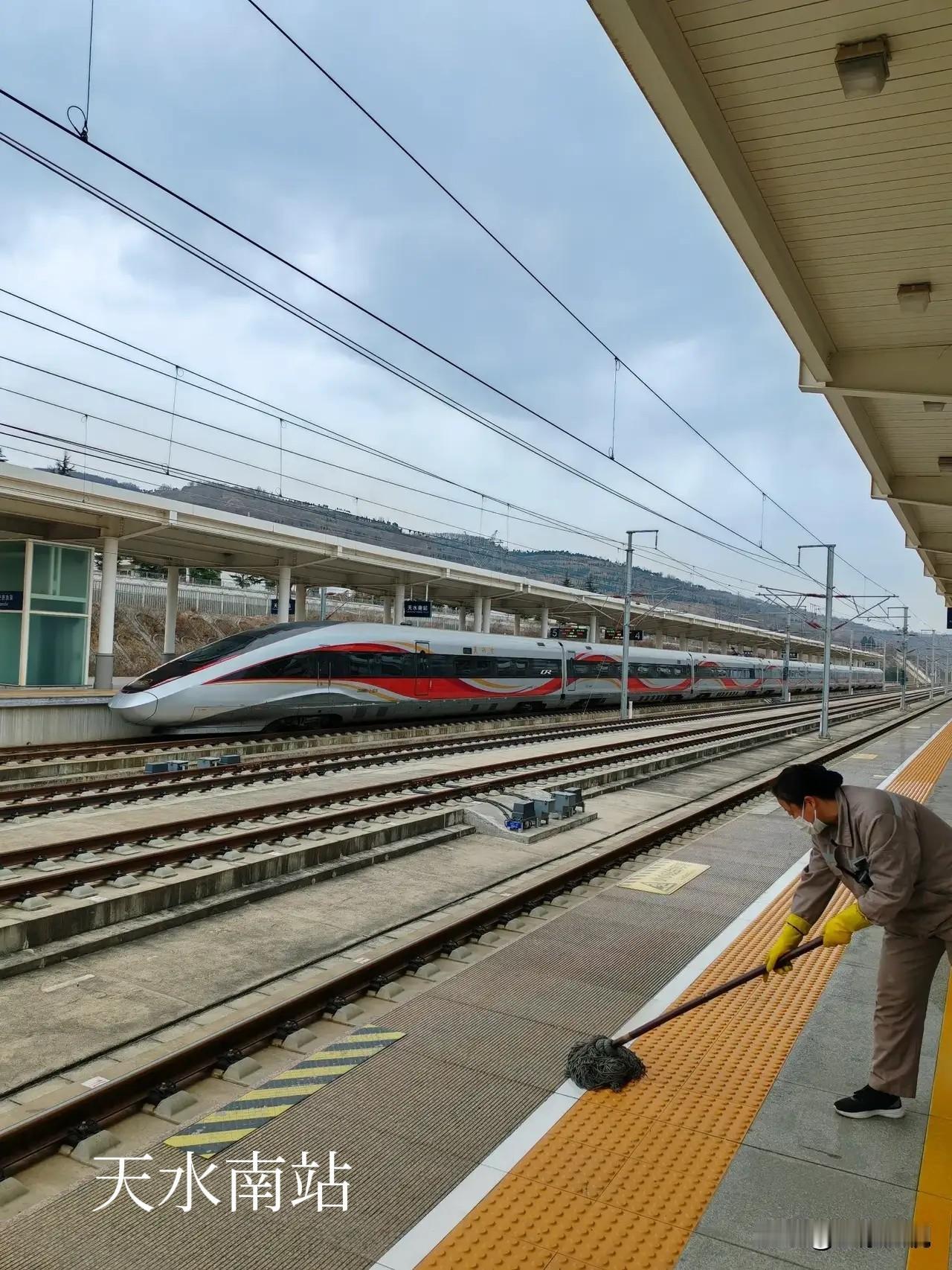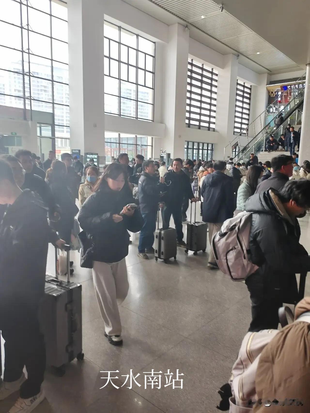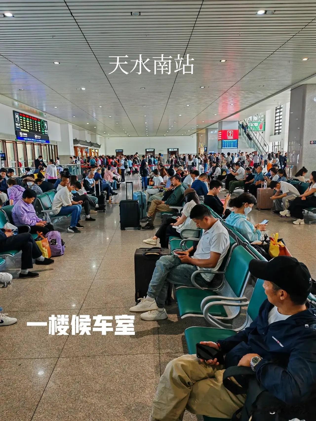 天水与宝鸡不愧为两个兄弟城市,就连高铁站都像孪生兄弟! 经常坐高铁往返于西安天水区间,但从来没有去过宝鸡南站里面,今天从天水南站去西安北,车票紧张买了个在宝鸡南换乘的票,到宝鸡南站里面一看,建筑风格与天水南站大同小异,都是从北面正门安检进入候车室,候车室也是上下两层,东西两头电梯上楼。区别就是宝鸡的候车空间大,座位少,旅客少,进站检票口略小,候车室周围店铺少,商业氛围不强,但线站多达14线8站台。而天水南站候车室相对空间小,座位多,旅客多拥挤,进站检票口大一点,只有9线5站台。 友友们觉得天水南站与宝鸡南站两个高铁站的候车室里面的格局和站台像不像?