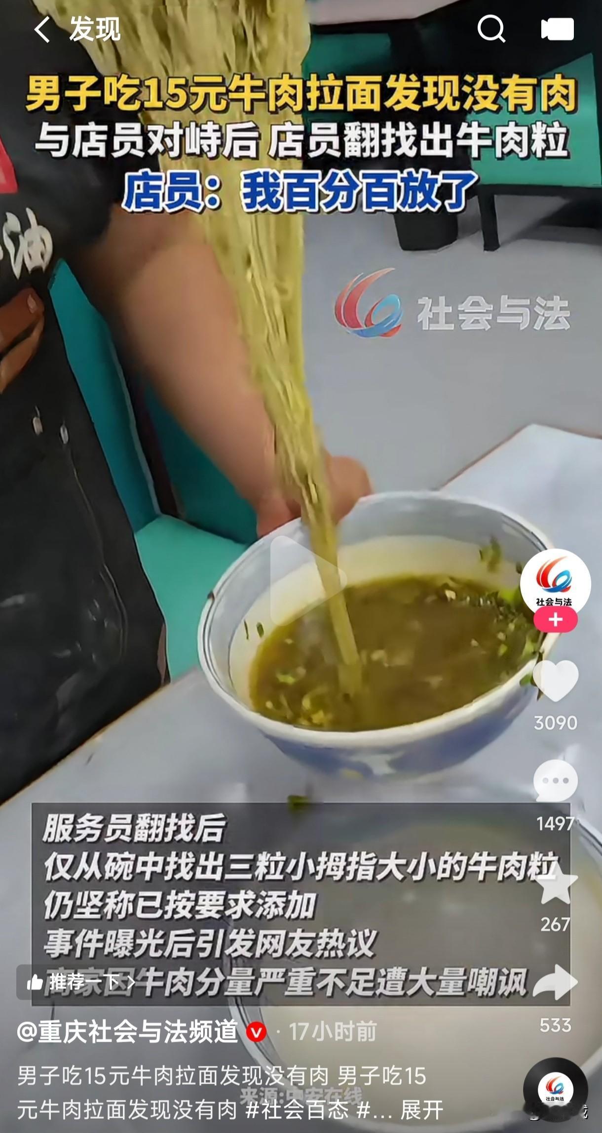 男子吃15元牛肉拉面发现没有肉,于是找店员对峙后,店员拿来一个空碗把面捞出后,从