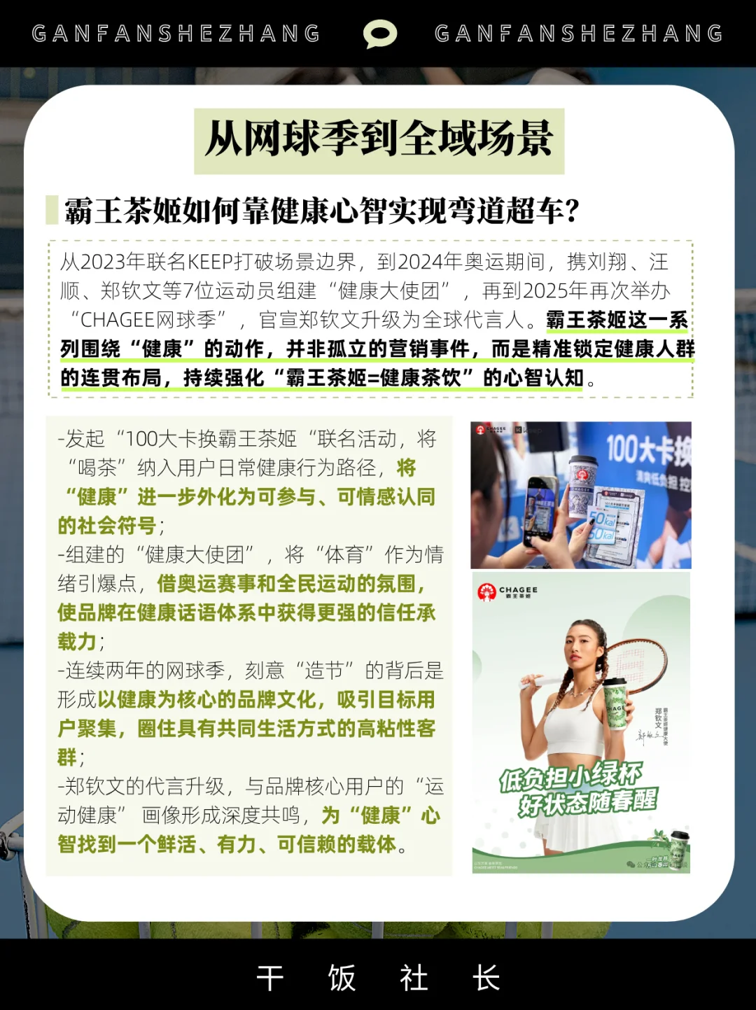 这一重磅消息在茶饮圈和体育圈都引发了高度关注,业内普遍认为这标志着霸王茶姬在健康茶饮赛道的布局迈入新阶段。从2024年邀请郑钦文出任首位健康大使,到今年官宣其升级为全球代言人,这一系列动作的背后,实则是品牌与核心用户群的同频共振:如今霸王茶姬的用户中,早已聚集了大批热爱健康、热衷运动的人群。