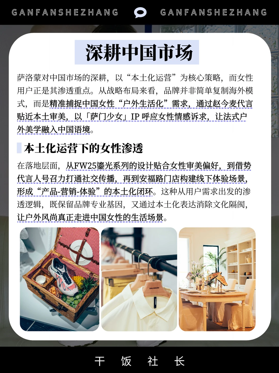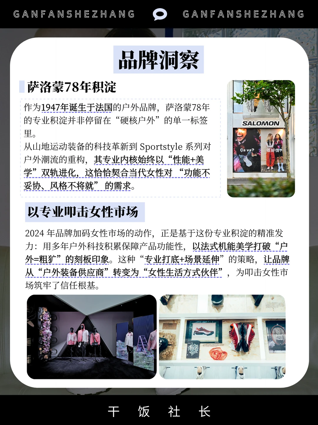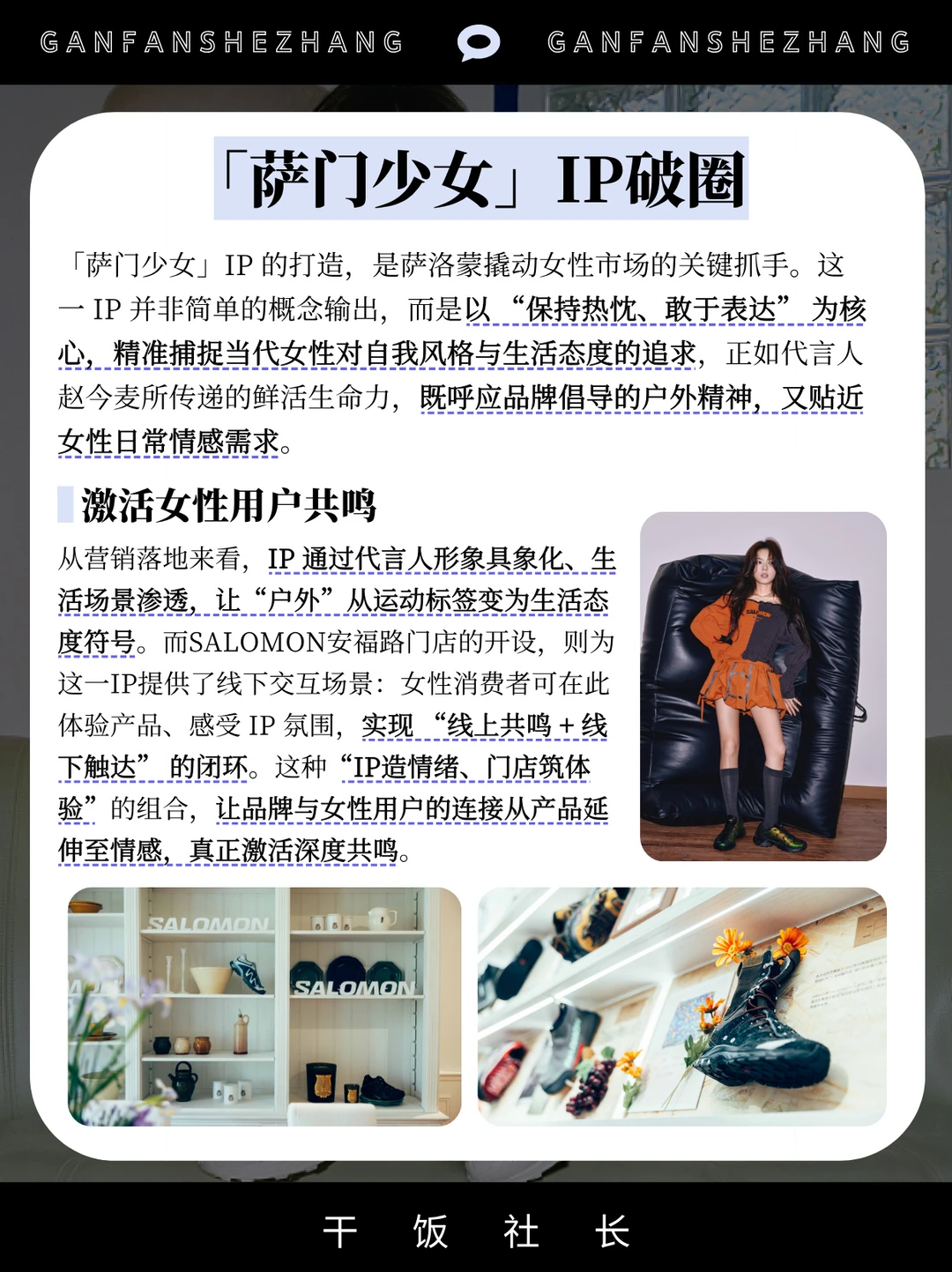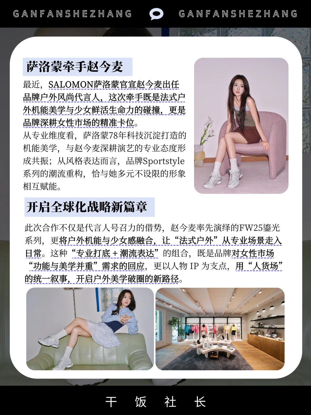 2024年品牌持续加码中国女性市场,借势代言人号召力+「萨门少女」IP打造,将户外态度注入女性生活场景。此次赵今麦代言及 FW25 鎏光系列推出,正是品牌深耕女性市场的关键落子。