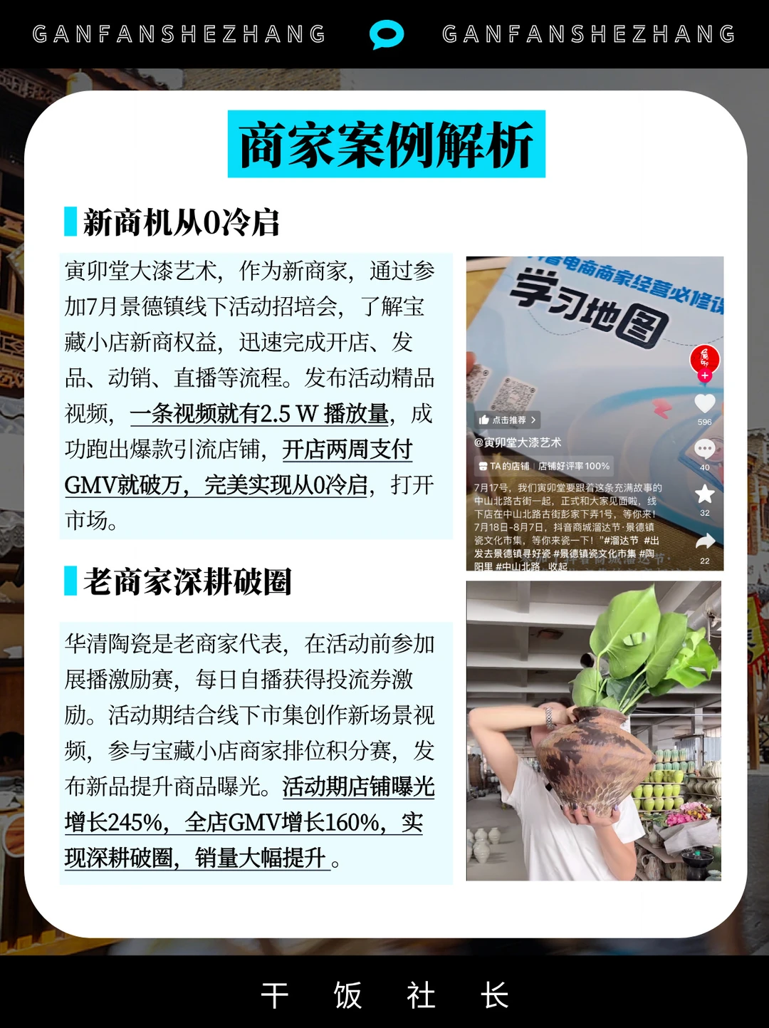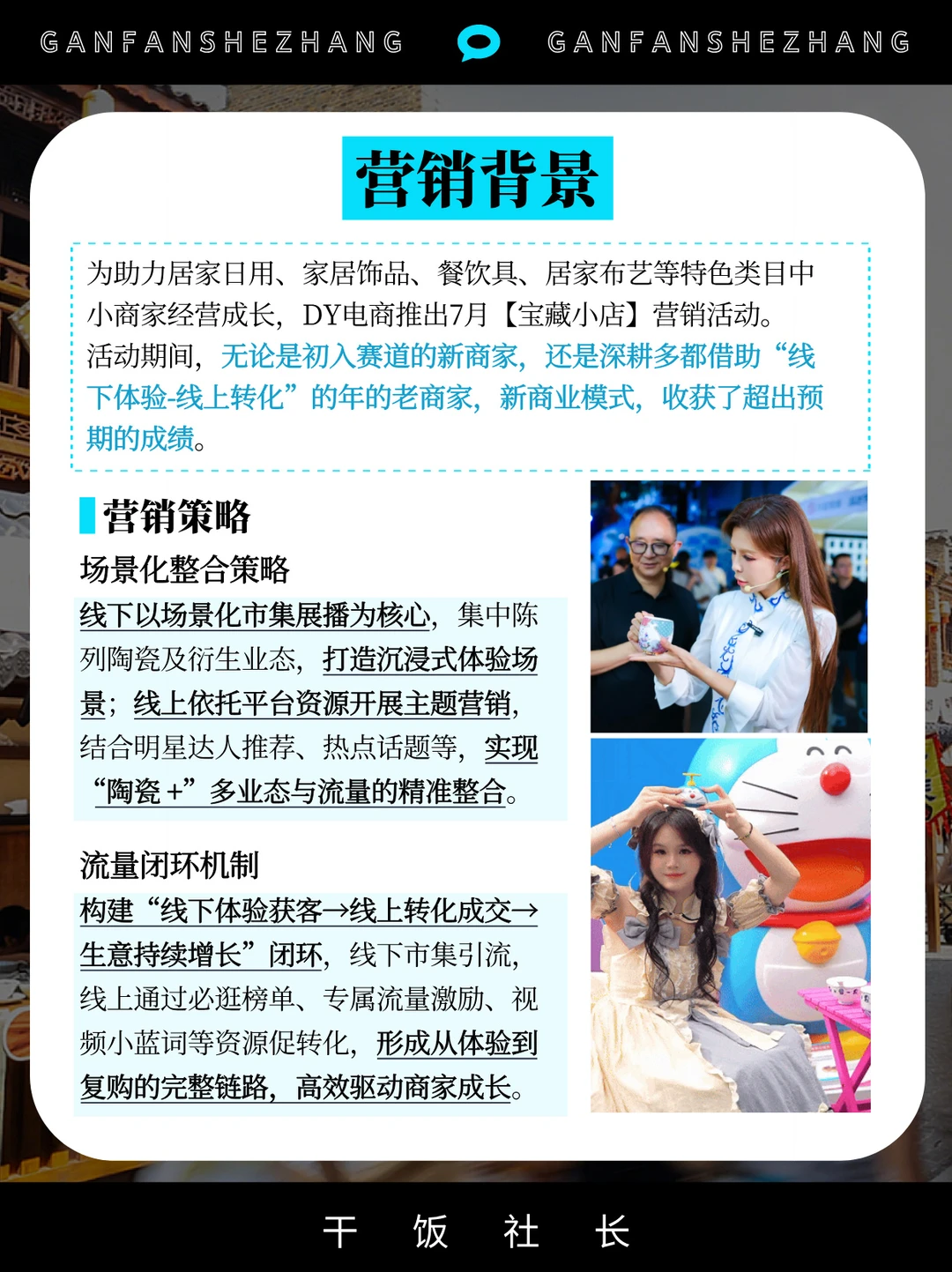 为助力居家日用、家居饰品、餐饮具、居家布艺等特色类目中小商家经营成长,DY电商推出7月【宝藏小店】营销活动打造出“线下市集展播+线上主题营销”的新商业模式🌟 线下通过场景化市集为商家提供展示窗口,线上依托平台丰富资源实现精准转化,形成“线下体验→线上成交→生意增长”的闭环🎯 无论是新商家冷启破万,还是老商家销量跃迁,均印证该模式能为中小商家提供低成本,高效率的成长路径,实现文化与商业的双重爆发🎊 本期针对「宝藏小店」7月活动深度解析👉 看中小商家如何通过这种新模式实现商业突围❓