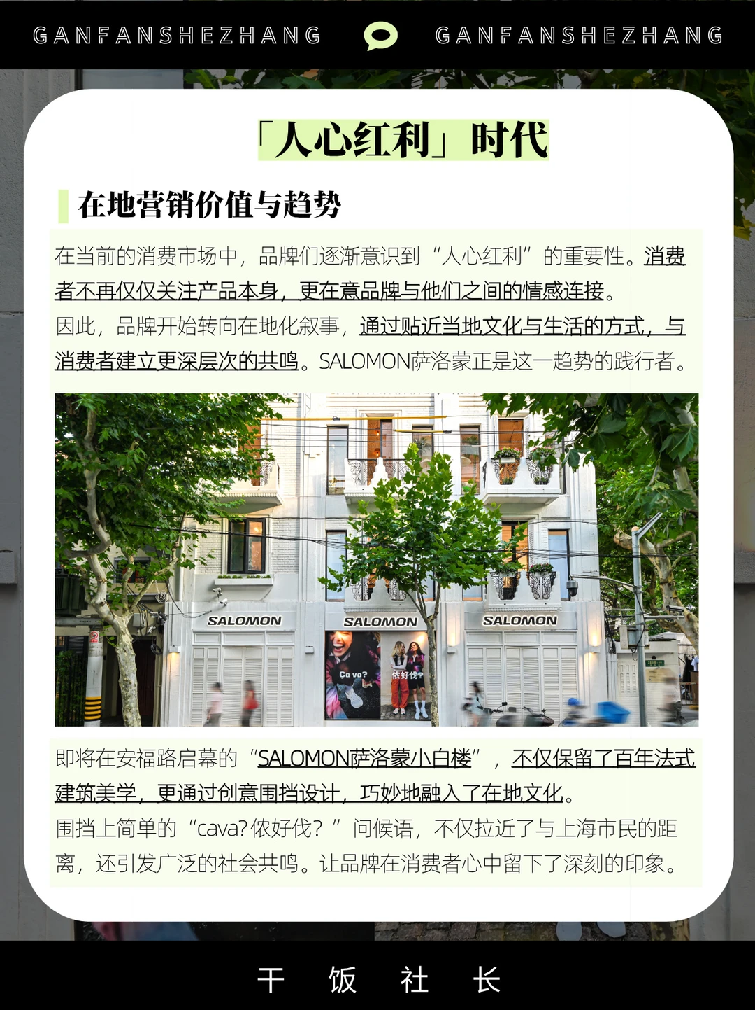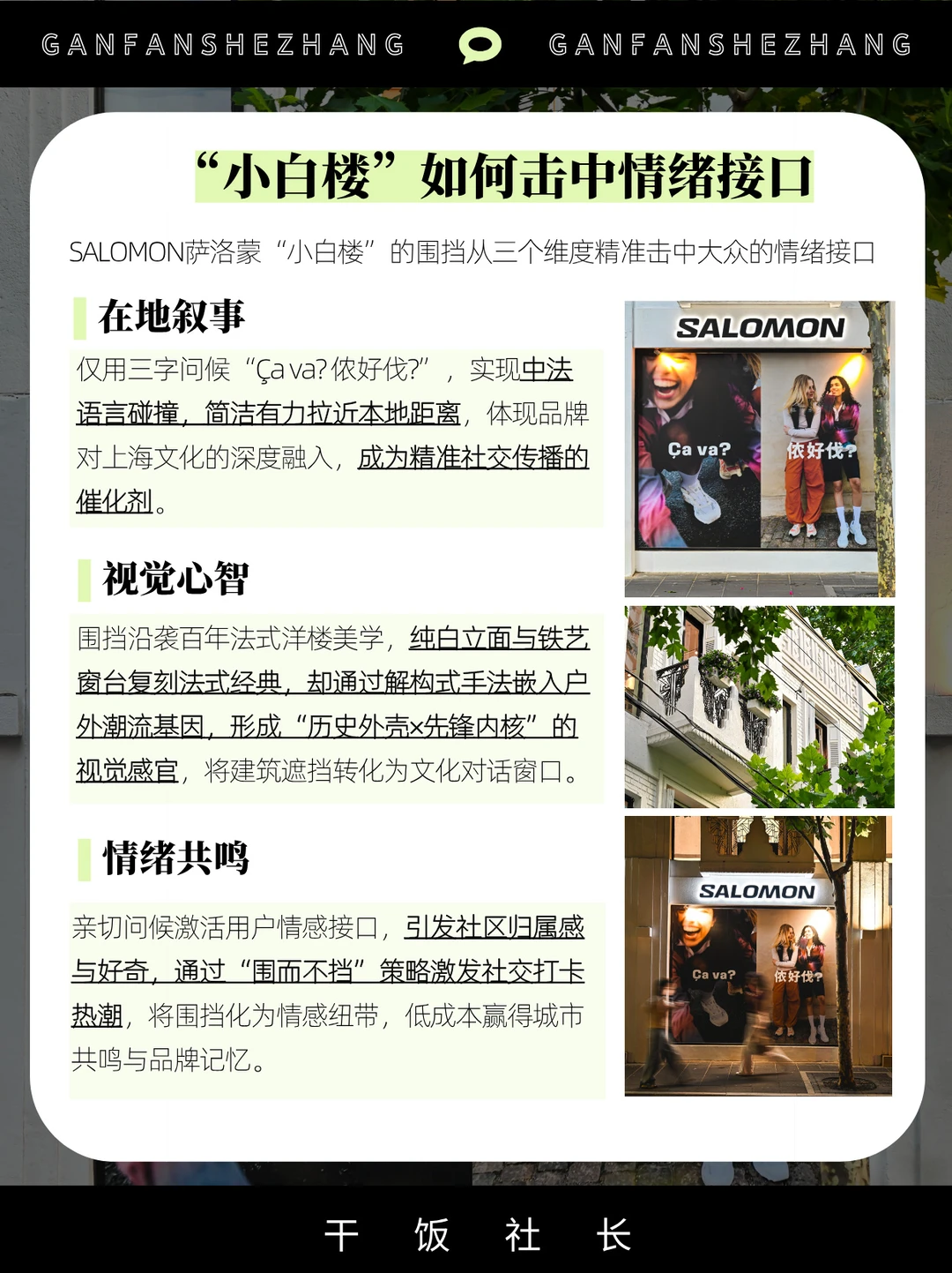 当前消费市场步入“人心红利”时代,品牌转向在地化叙事,围挡从单纯遮挡进化为情感沟通工具。 6月28日SALOMON萨洛蒙在安福路的新店预开业。 据说这栋“小白楼”是SALOMON专为中国市场打造的全新概念店铺,整体创新上沿袭百年法式建筑美学,通过解构式将品牌户外潮流基嵌入建筑肌理,形成“历史内核×先锋基因”的视觉心智。 而开业前,“小白楼”的创意围挡更是仅有三字问候引爆城市共鸣,本期我们就来看看它是如何实现“围而不挡”的社区渗透❓又是如何用文化叙事引爆社交打卡,激活情绪接口❓