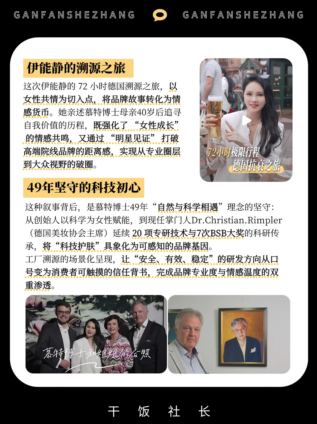 最近刷到伊能静亲探慕特博士德国工厂的视频 我被姐姐自然流露的情感叙事给深深打动💓 她从一位女性去看另一位女性独立自强的故事 跨越时间长河,让大众看到49年坚守的品牌初心 也让我对她溯源的品牌慕特博士有了更深的认识 在商业世界不断演变且竞争日益激烈的当下 情感叙事已成为企业不可或缺的重要资产 是消费者和品牌之间的“情感”切入点 更能激发消费者的潜在购买意识 相比一味的去讲产品,介绍功效和卖点 这种从情感到品牌内核再传递品牌差异化优势 不仅快速抓取消费者的注意力 也完成了品牌心智的占位🎯