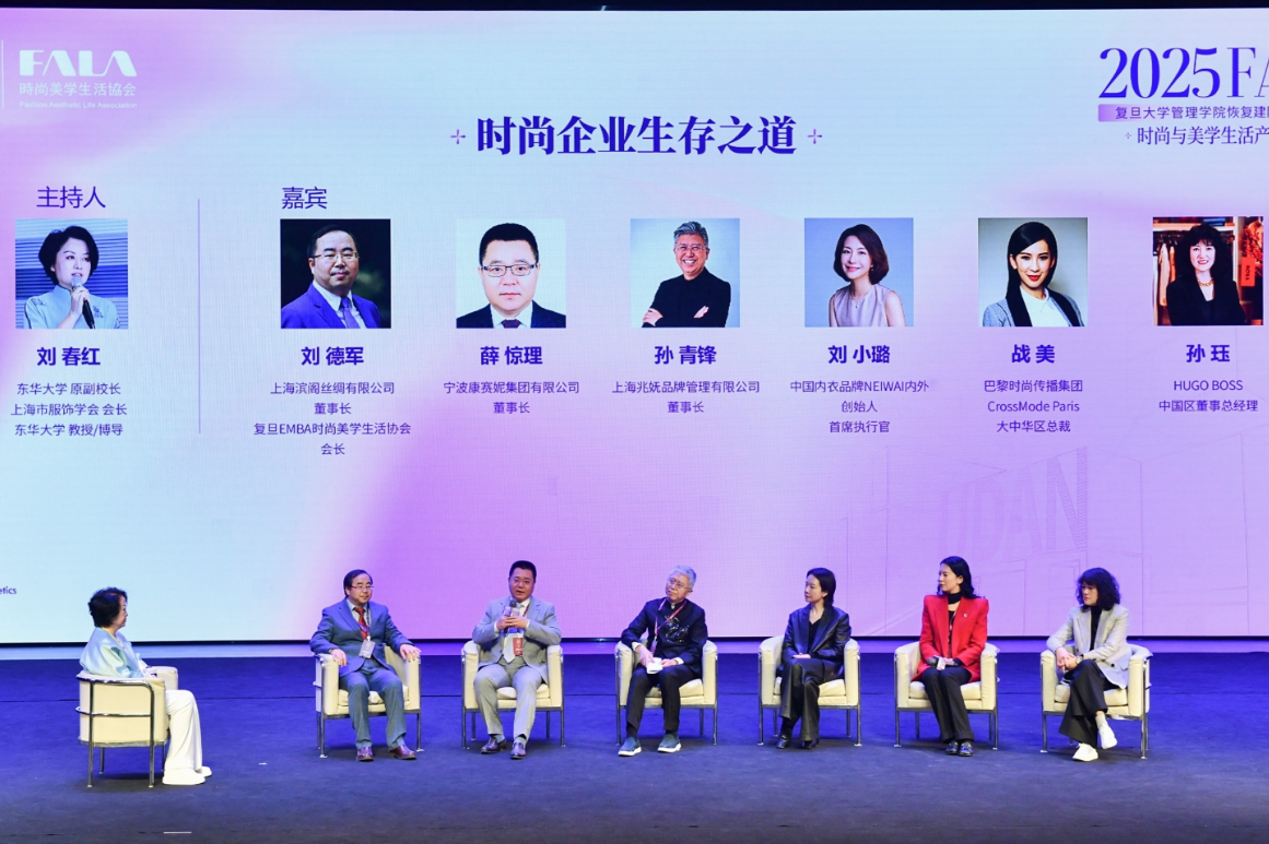 另一场“时尚企业生存之道”圆桌讨论则在东华大学原副校长、上海市服饰学会会长刘春红教授的主持下,邀请上海滨阁丝绸有限公司董事长刘德军、宁波康赛妮集团董事长薛惊理、上海兆妩品牌管理有限公司孙青锋、HUGOBOSS中国区董事总经理孙珏、NEIWAI内外董事总经理刘小璐、巴黎时尚集团传播有限公司CROSSMODE大中华区总裁站美等企业家展,共同探讨企业在复杂环境中的持续增长之道。