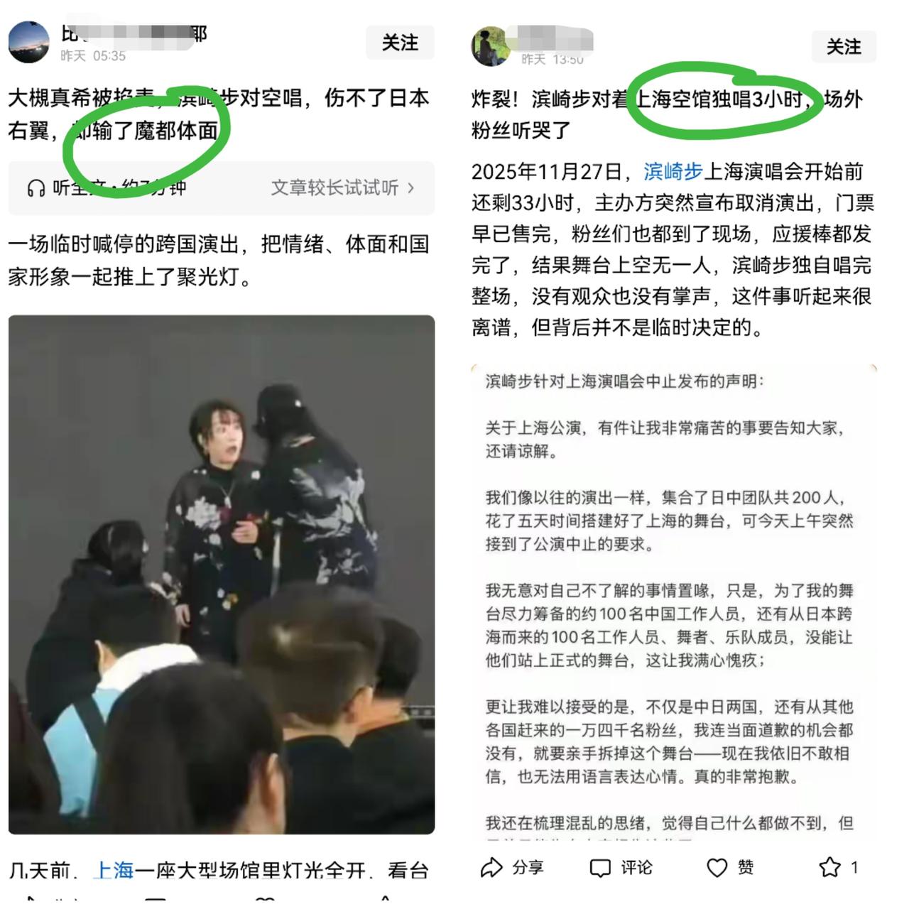 假的!这下事情大了。 到底是谁在炒作“滨崎步上海无人演唱会”? 所谓滨崎步“一个人的演唱会”信息不实,系彩排期间被偷拍,摄像团队人员公开致歉。 这个假消息前两天在网络上吵的飞起。 大谈滨崎步的契约精神,大谈政治与文旅要脱钩。 还把《新加坡联合早报》以及日本前首相鸠山由纪夫也扯进来了! 这下有些人要被打脸了。
