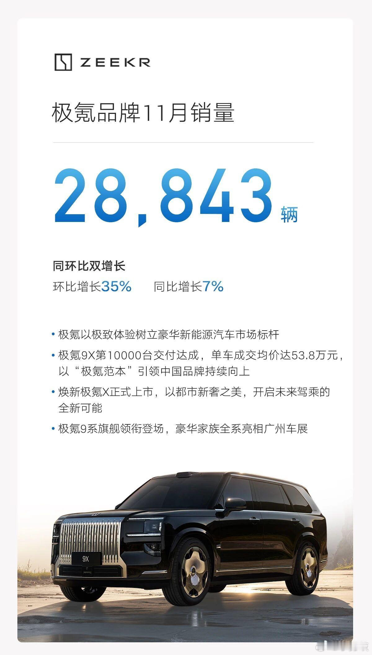 吉利汽车11月销量310428辆,连续9个月同环比双增长,官方更是用“势不可挡”