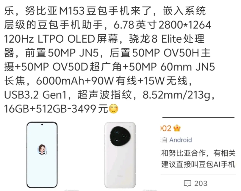 没看错,豆包也推出手机了,字节和努比亚联合研发的,定制版手机?这个配置看上去也还算不低,也不便宜,512内存要3499起,处理器用的是去年的骁龙至尊8E,其实也足够用了,至于这个后盖模组嘛,只能说辨识度确实高,电池容量稍微少了一点。