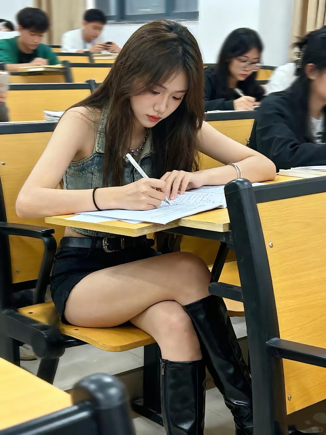 教室里的笔尖沙沙响,她把认真写进笔记里,吊带和牛仔裙裹着青春的松弛感,长靴踩稳了