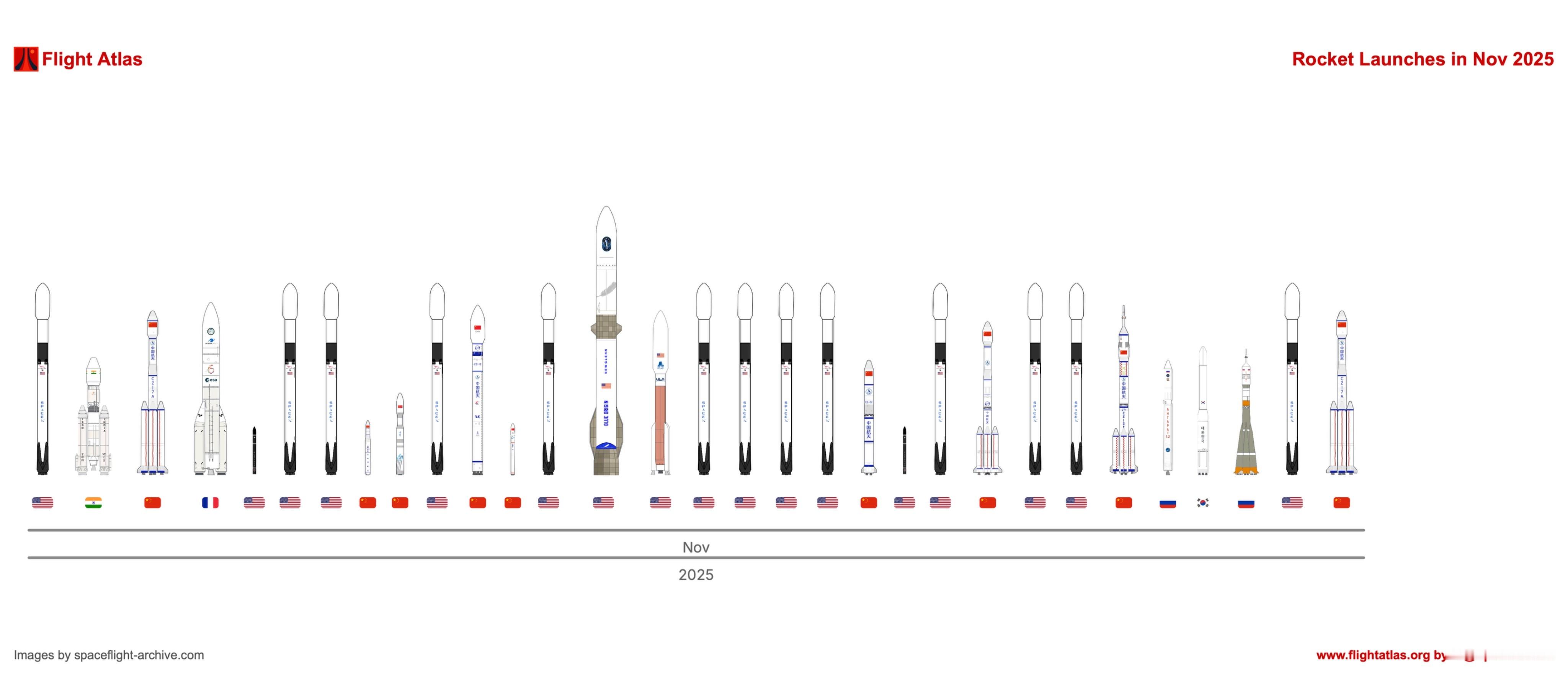 11月的30天内全球总共发射了31枚火箭,今年11月成为史上第一个发射次数超过天数的月份。
