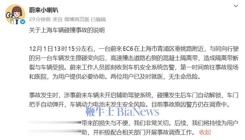 12月1日,蔚来汽车官方辟谣微博号“蔚来小喇叭”今日发布“关于上海车辆碰撞事故的说明”。