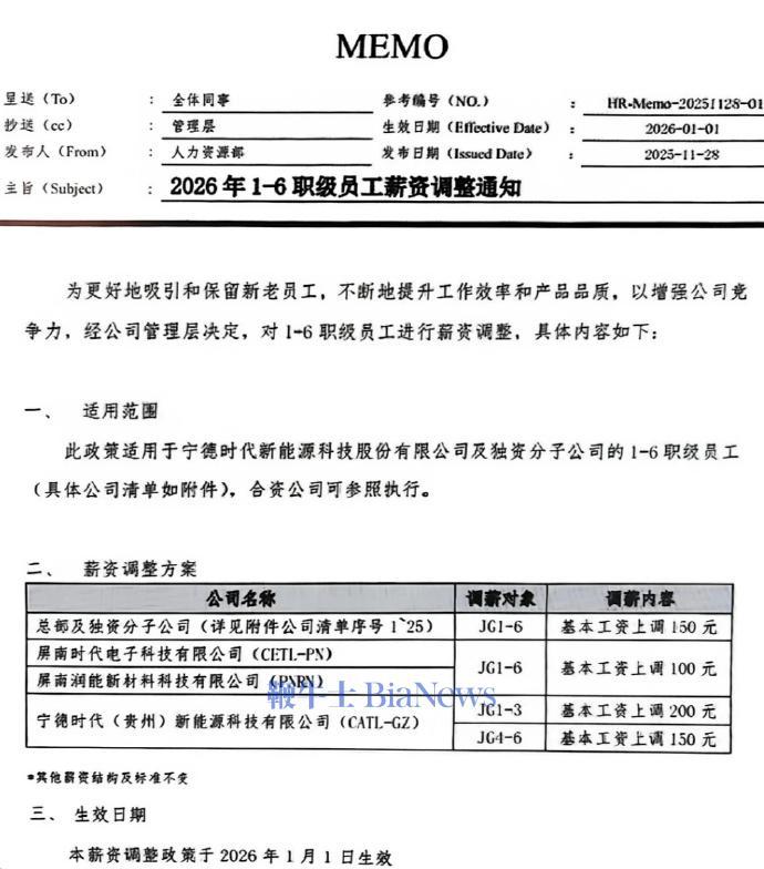 近日,有网友爆料称,宁德时代发布涨薪通知。