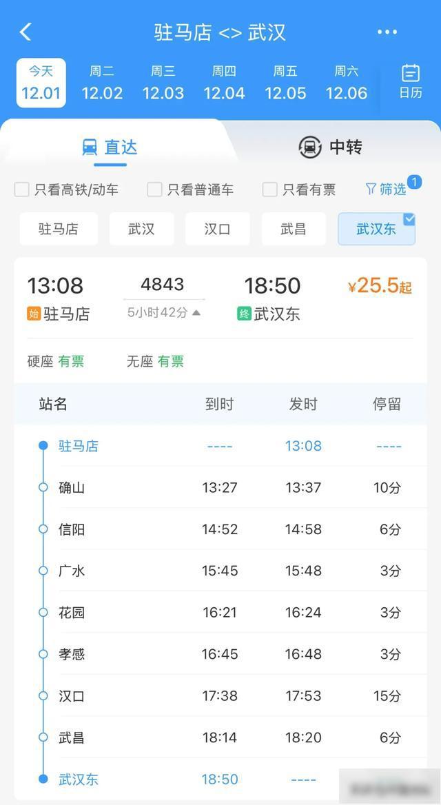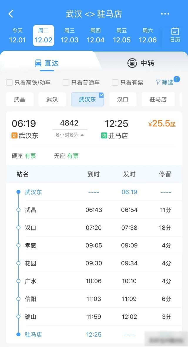 铁路12306App显示,该趟列车票价仅25.5元。其中,武汉东站4842列车6:19始发,经停武昌、汉口、孝感、花园、广水、信阳、确山等7站,12:25抵达驻马店。驻马店4843列车13:08始发,经停确山、信阳、广水、花园、孝感、汉口、武昌等7站,18:50抵达武汉东。