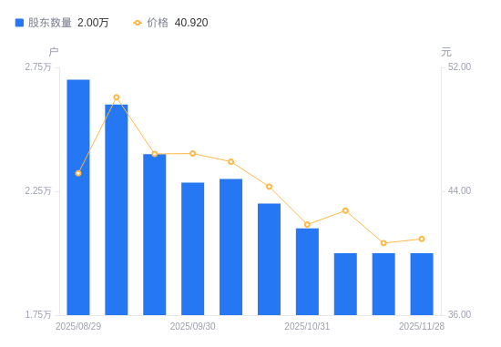 日期A股户数(户)流通A股户均持股数(股)户均持股市值(万元)2025-11-28200006858.2028.062025-11-20200006858.2027.882025-11-10200006858.2029.322025-10-31210006531.6227.332025-10-20220006234.7227.622025-10-10230005963.6527.382025-09-30228506002.8027.882025-09-19240005715.1626.522025-09-10260005275.5426.412025-08-29270005080.1522.94