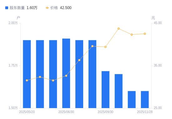 日期A股户数(户)流通A股户均持股数(股)户均持股市值(万元)2025-11-281600012140.4451.602025-11-201600012140.4451.352025-10-311700011426.3049.942025-09-301717411310.5344.562025-08-291900010223.5340.462025-07-311900010223.5337.112025-06-301908810176.3933.192025-06-201900010223.5332.202025-05-311900010223.5333.062025-05-201900010223.5332.22