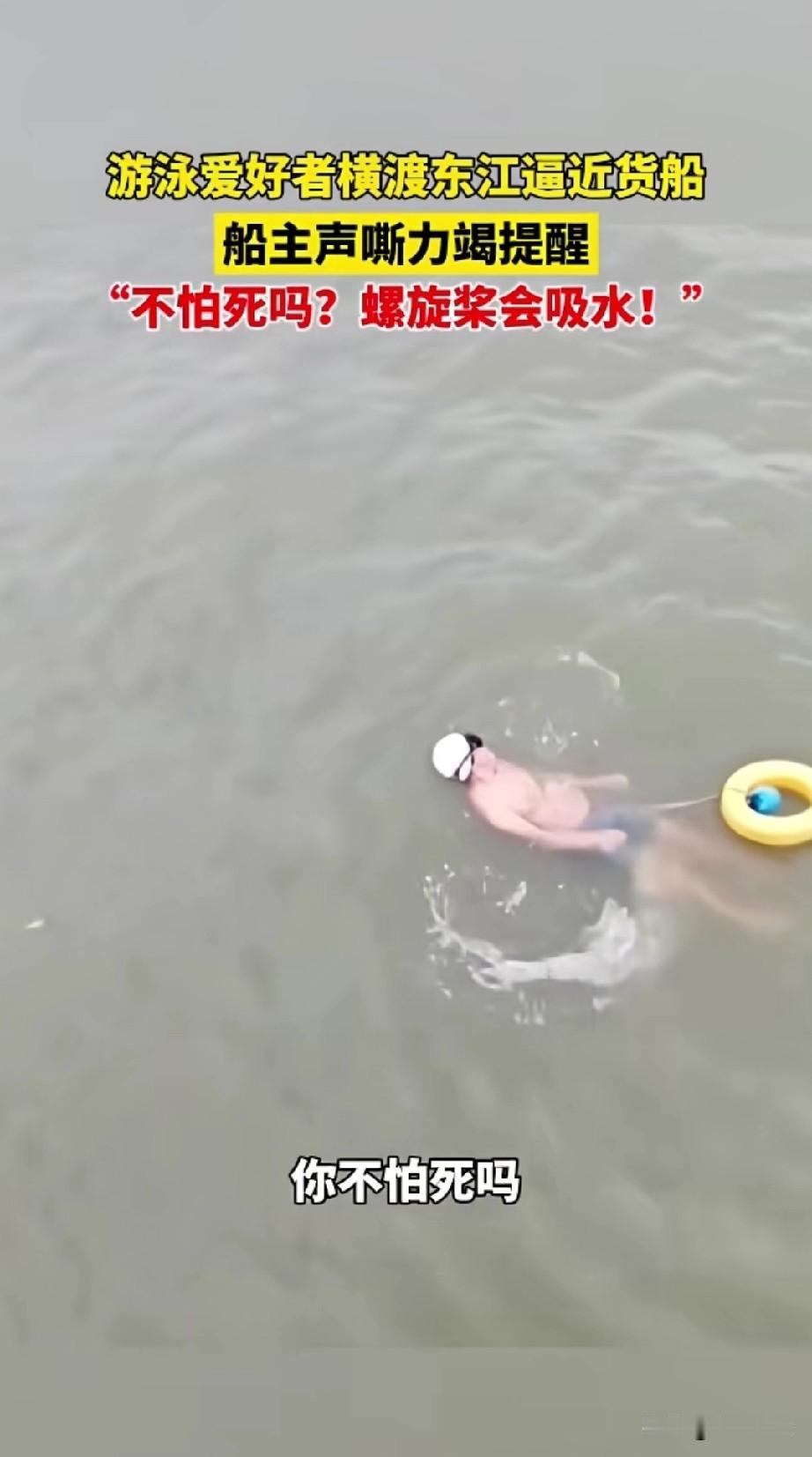 近日广东惠州游泳爱好者, 横渡东江逼近货船, 船主声嘶力竭提醒引关注, 船主让游泳爱好者游回去, 两名游泳爱好者视若无睹, 装作没有听到, 还在向船体逼近, 似乎在炫耀自己游泳技术, 知道船主喊出不怕死吗? 螺旋桨会吸水, 听到这话的永远爱好者, 耳背立即就好了, 迅速远离货船, 两个游泳池爱好者, 真是把船主吓的不行, 拿自己的生命在冒险, 还真是心大, 一旦出事可不得了! 大家对于这两位游泳好者靠近货船怎么看? 东江岸边 惠州新航道 东江湖船只侧翻 东江湖翻船 东江湖禁止游泳