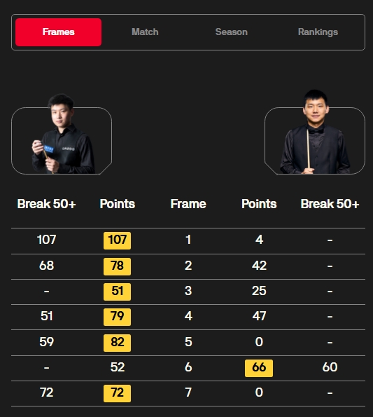 上半场赵心童取得4-0的领先,第五局场面一度焦灼,最终赵心童抓住机会打出单杆59分率先拿到赛点,第六局龙泽煌打出单杆60分并晕进超分粉球获胜,第七局赵心童打出单杆72分制胜。