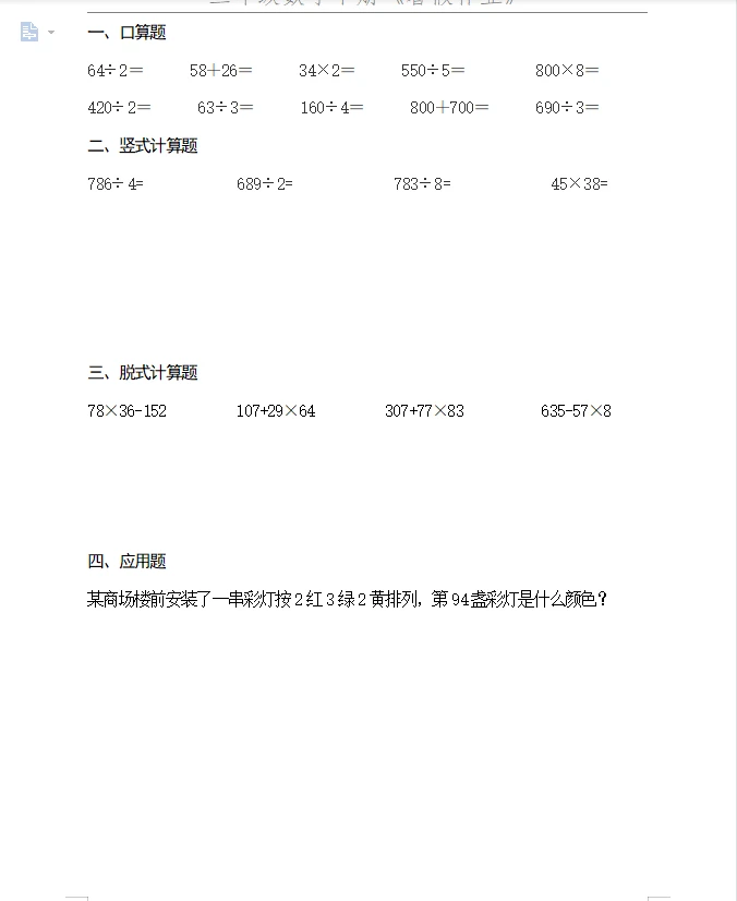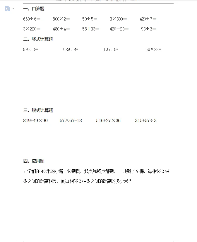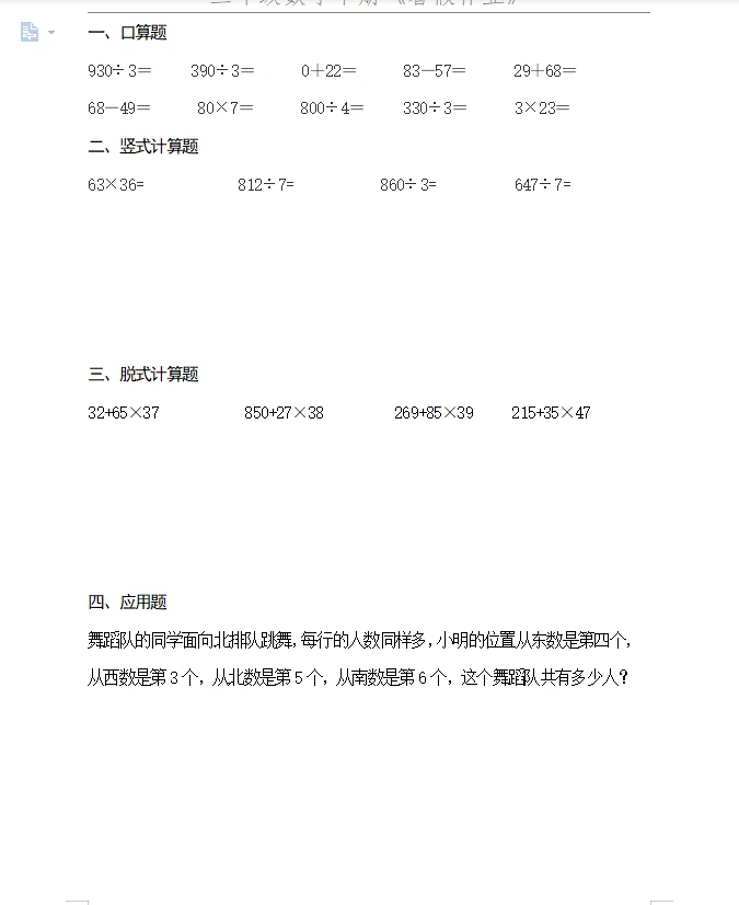 暑假作业50套三年级数学下册