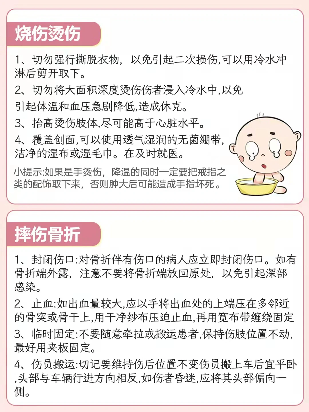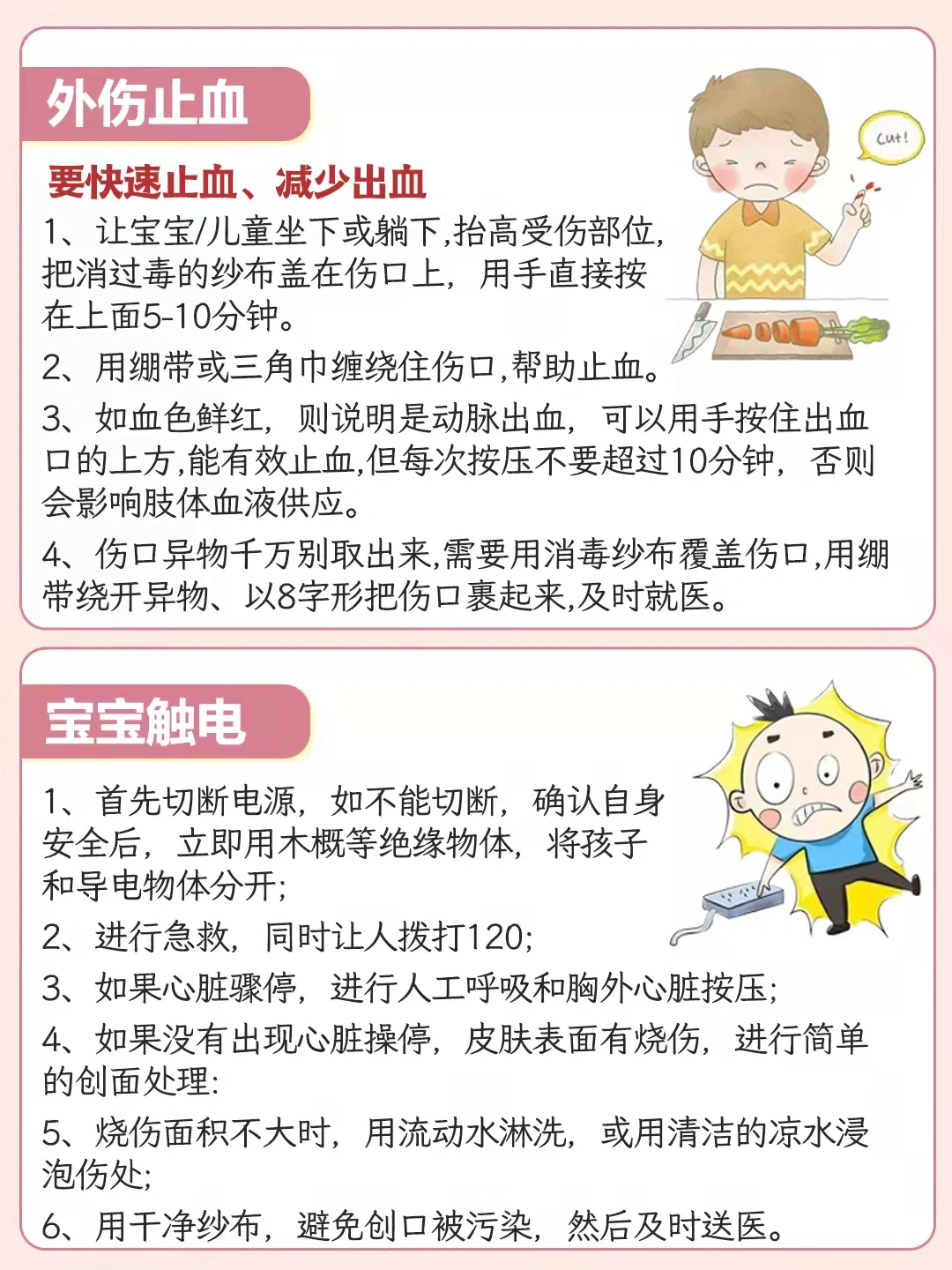 伴随着宝宝的成长发育,从翻身、坐起、站立、到走路等等,不可避免会发生一些意外伤害‼️为了防止意外造成的伤害,家中危险的物品都要收好,放到👶够不到的地方。面对各种防不胜防的意外伤害,家长最好也要掌握1⃣️些婴幼儿急救常识。