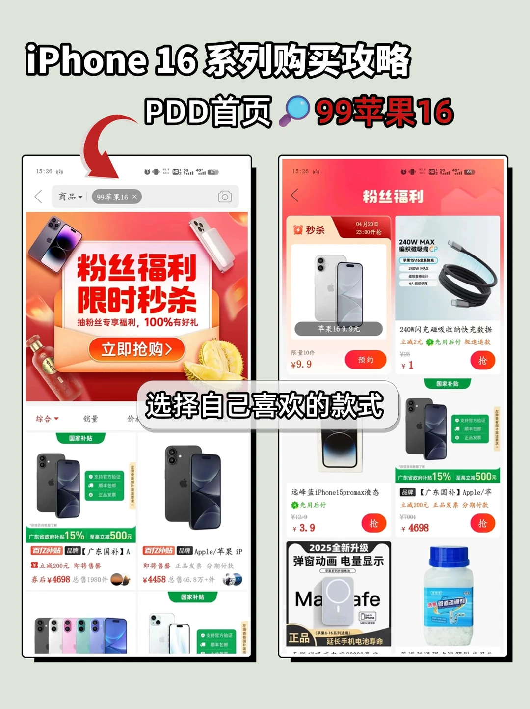 打开PDD,搜索【99苹果16】就能参与9块9秒杀苹果16系列手机专场,大家都有机会,快去试试吧~