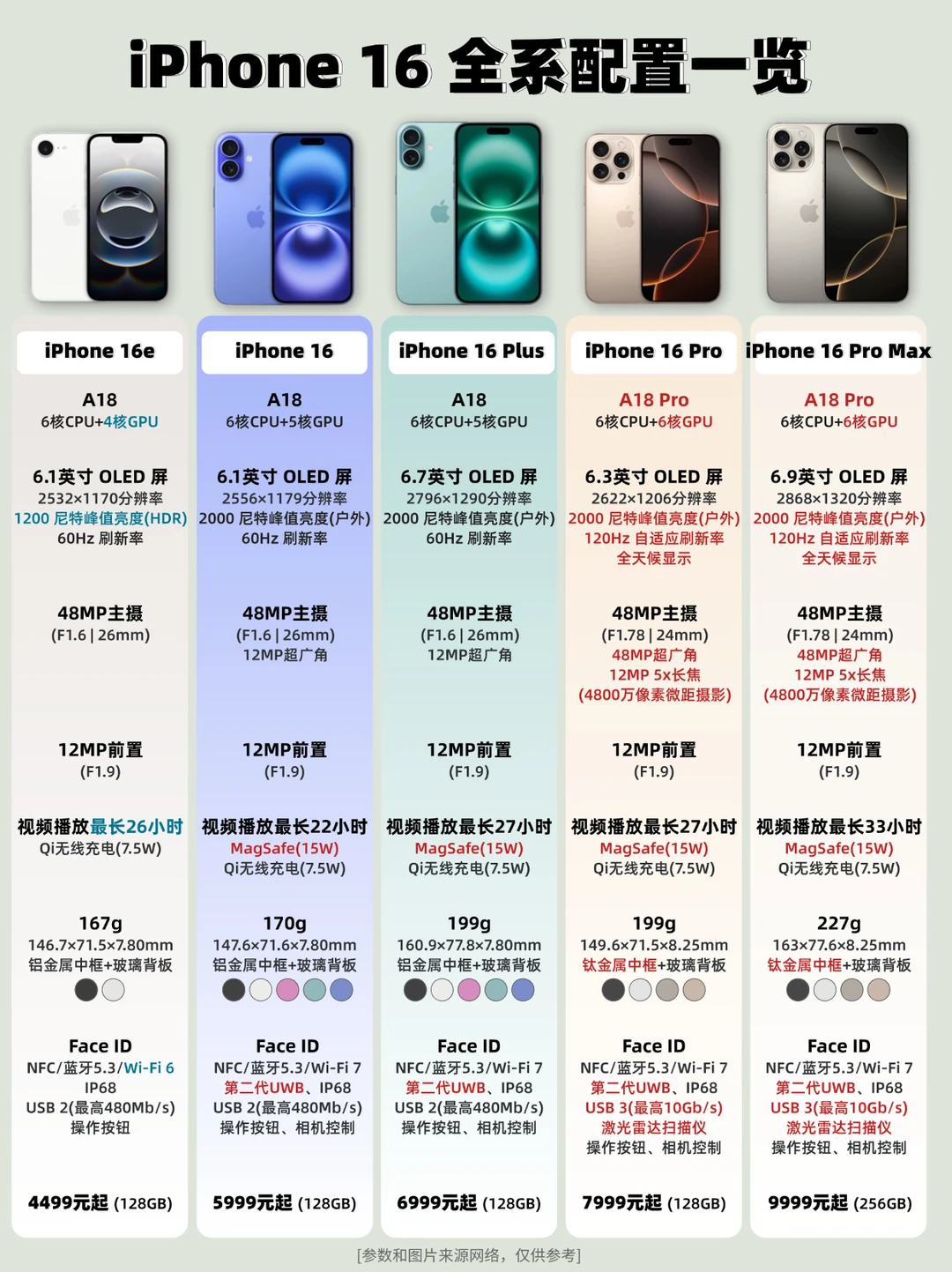 iPhone 16e的A18芯片为4核GPU,满足日常使用需求,配备6.1英寸刘海屏(非灵动岛),支持60Hz刷新率,后置为4800万像素单摄,适合拍照需求低、预算有限的用户。