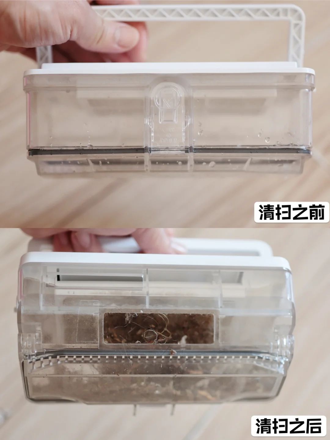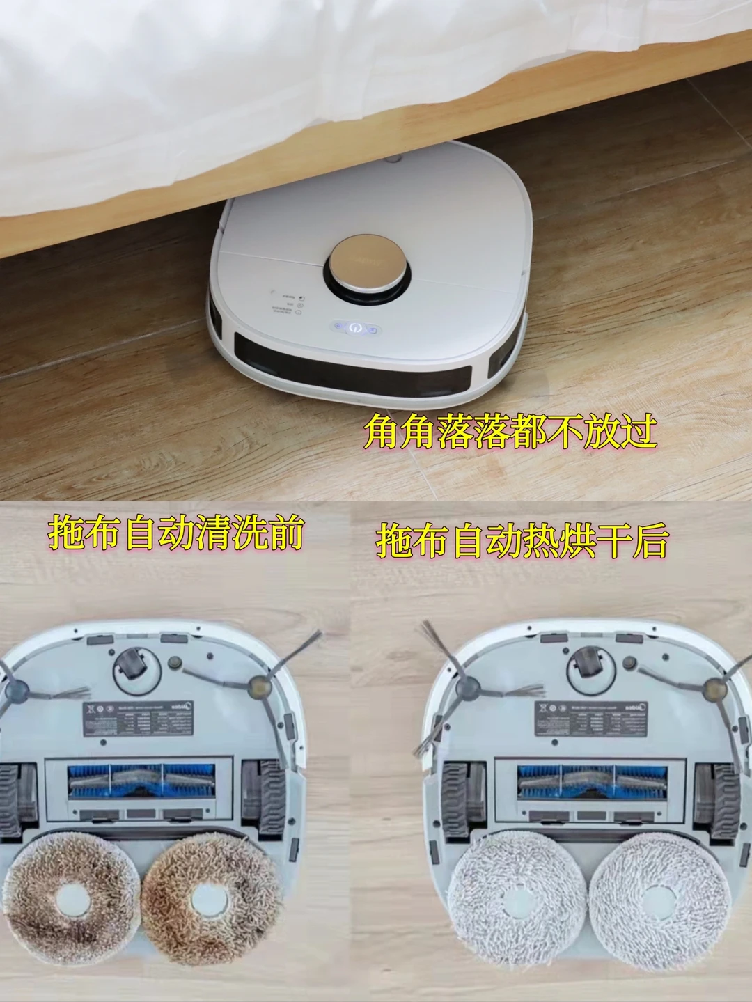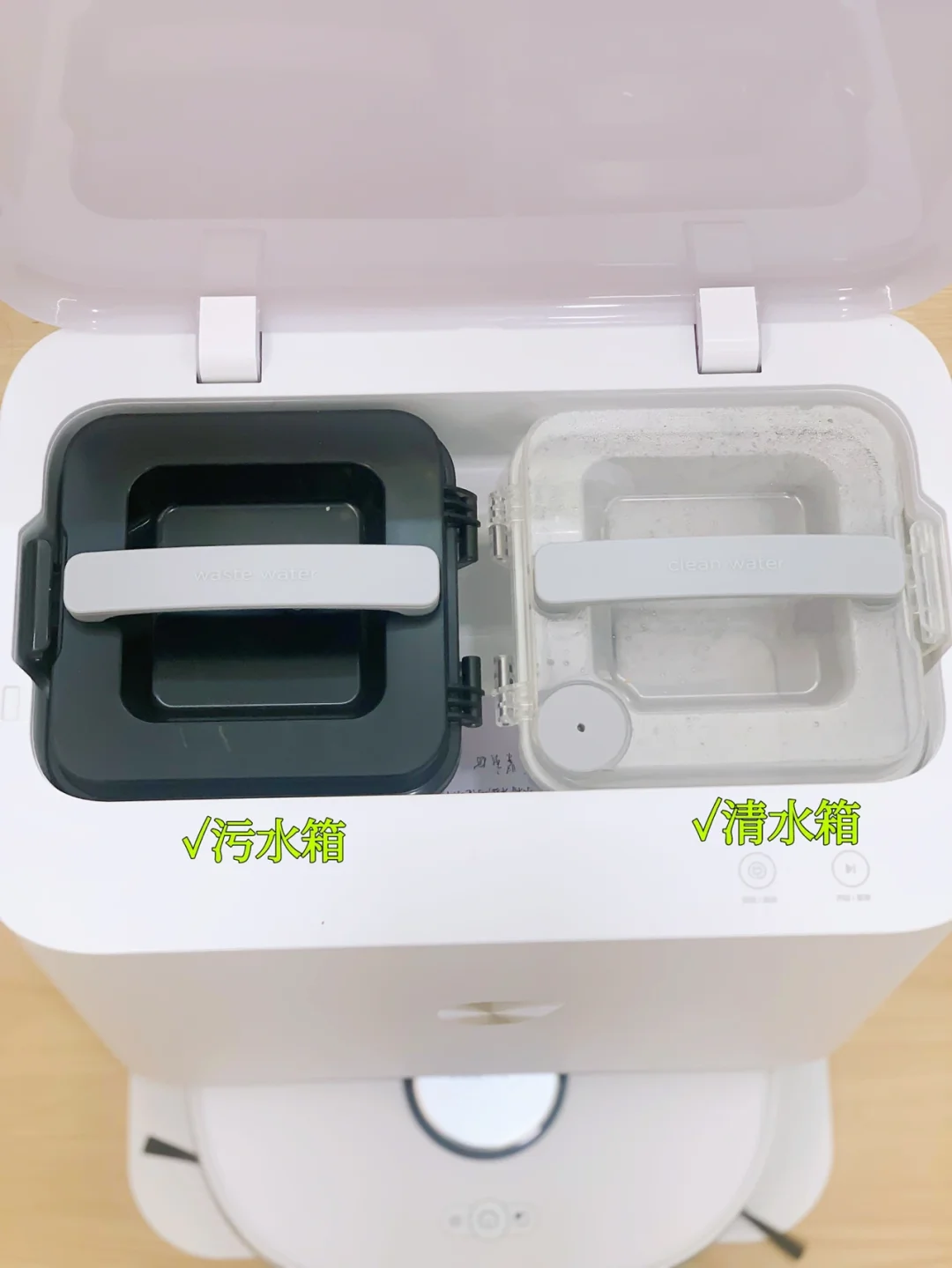 冬天不碰水,自动洗烘拖布:地面都打扫完后,它就乖乖的回基站自动洗拖布了,全程不用我动手操作‼️尤其在冬天,不用亲手洗拖布和烘干拖布,真的超贴心❤️拖布清洗过程中,它会用清水箱的水洗净拖布,把脏水排到污水箱里,洗完之后,它用5⃣️5⃣️度的热风烘干抹布,2⃣️个半小时之后就烘干了。这下抹布不会因为忘记洗而发霉滋生细🦠菌了。而我要做的,就是把污水箱的水倒掉,以及及时给清水箱装水啦[黄金薯R]