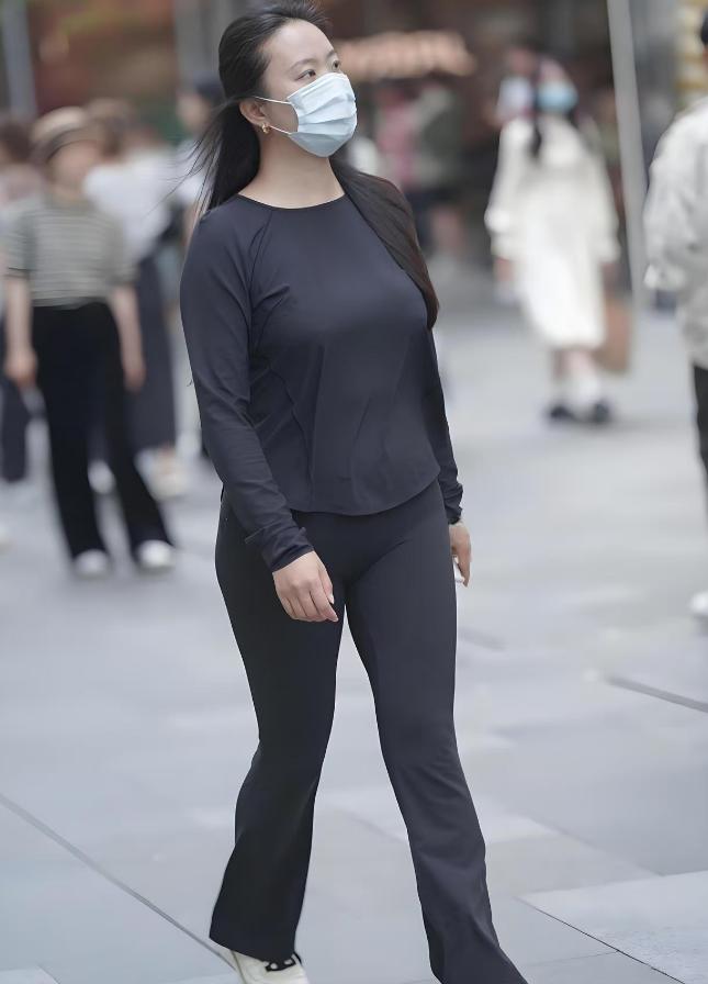 美女这身全黑的穿搭特别利落又显气质。 长袖上衣和微喇紧身裤的组合,既贴合身材线条,又用微喇的裤型增加了随性感,搭配一双小白鞋,让整体不会显得沉闷,反而多了几分清爽的活力,走在人群里简约又有辨识度,很适合日常出行,舒适又能凸显干练的气质。