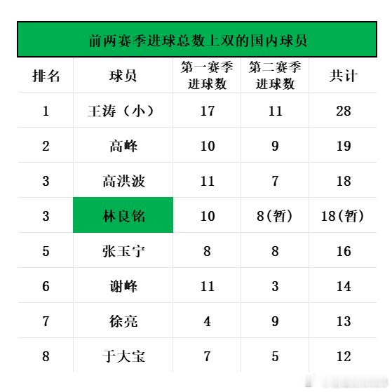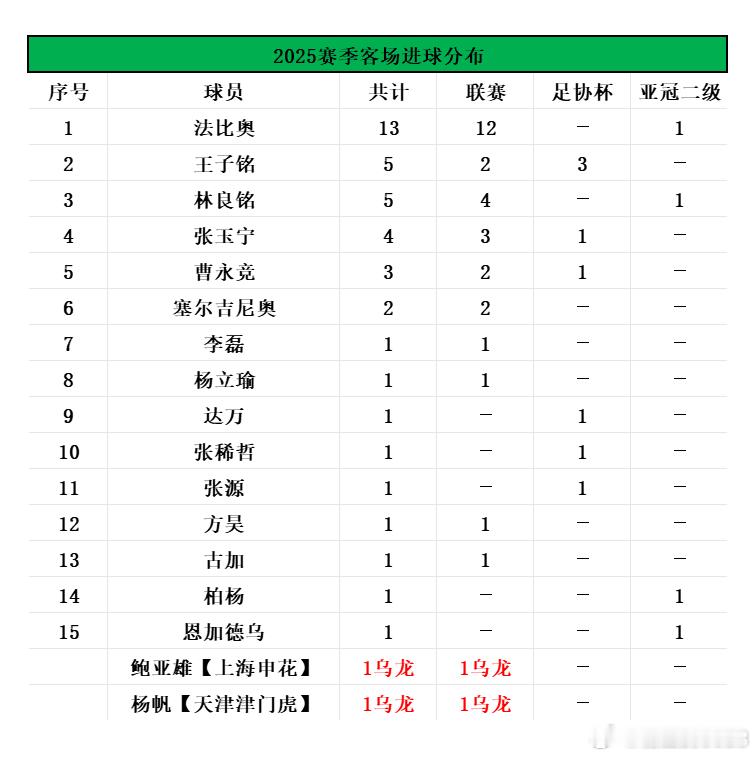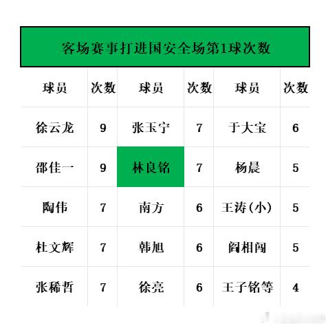 河内公安2-1北京国安:赛后大小数据📊林良铭第50次首发破门,张健智成队史亚冠扑点第二人,国安客场赛事数据初盘。【林良铭】⚽本场比赛打进1球,这是林良铭本赛季第8球,国安生涯第18粒进球,队史射手榜超越杨昊,追平高洪波、王晓龙和朴成。⚽林良铭上赛季加盟国安,两个赛季共打进18球,队史国内球员前两个赛季进球数追平高洪波并列第3位,仅次于小王涛🕯️、高峰。【图5】📊加盟国安前两赛季进球上双的国内球员。⚽这是林良铭第7次在客场赛事打进国安全场第1球,与陶伟、杜文辉、张稀哲、张玉宁并列国内球员第3位,仅次于徐云龙和邵佳一。【图6】📊客场赛事打进国安第1球次数排名。⚽本场比赛是林良铭第50次以首发球员的身份为国安出场。·【张健智】🙌本场比赛扑出对方球员莱奥·阿图尔的点球,这是张健智加盟国安后第2次面对点球,首次将其拒之门外。🙌张健智成为国安队史第2位在亚冠赛事(精英+二级)扑出对方点球的门将,第1位是柏小磊, 他曾在2012赛季亚冠对阵蔚山现代的比赛中扑出郭泰辉的点球。🙌张健智的扑点是国安门将本赛季第4次扑出对方点球(含点球大战),断层领先其他赛季。【图7】📊2004赛季至今国安门将扑点一览。·【曹永竞】🟥本场比赛尾声因暴力动作染红离场,这是国安在亚冠二级联赛的首张红牌,也是曹永竞个人本赛季第2次被红牌罚下,上一次有国安球员单赛季领到2张红牌还是2017赛季的张稀哲和赵和靖。·【北京国安·客场】⚽本场比赛结束之后,国安本赛季主客场制的客场比赛全部结束,共计21场比赛,战绩为8胜7平6负,进43球失37球,其中进球和失球均属队史单赛季最多。🎉破纪录!国安本赛季共打进43粒客场进球,超越2018赛季的32球成为客场进球最多的一年;同时本赛季15人在客场破门也是队史最多一次,打破2014赛季14人的纪录。【图8】📊本赛季43粒客场进球分布。🎉破纪录!法比奥本赛季客场各项赛事共打进13球,单赛季个人客场进球队史最多,打破以往10球的纪录(2005耶利奇、2017索里亚诺、2018巴坎布、2019巴坎布,客场均打进10球)。⚽截至目前北京国安共计进行了492场客场比赛,战绩为156胜156平180负,进604球失614球。【图9】📊北京国安客场各项赛事总战绩(数据统计方式如图)。