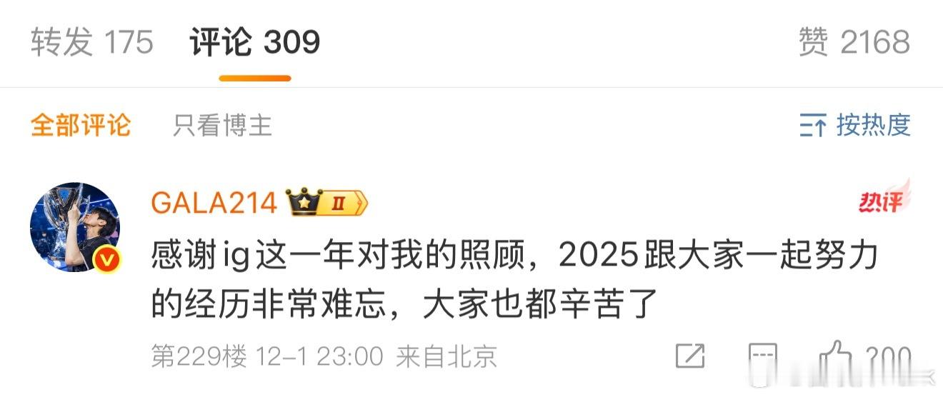 就在刚刚,Gala在评论区回复了iG:感谢iG这一年对我的照顾,2025跟大家一起努力的经历非常难忘,大家也都辛苦了!梦一样的25極,我还记得去年这个时候iG全神班TheShy、Jiejie、Rookie、Gala、Meiko成都第一次亮相,留下了美好的回忆,就这样散了……可惜Gala回复iGGala感谢iG的照顾ACG优创官