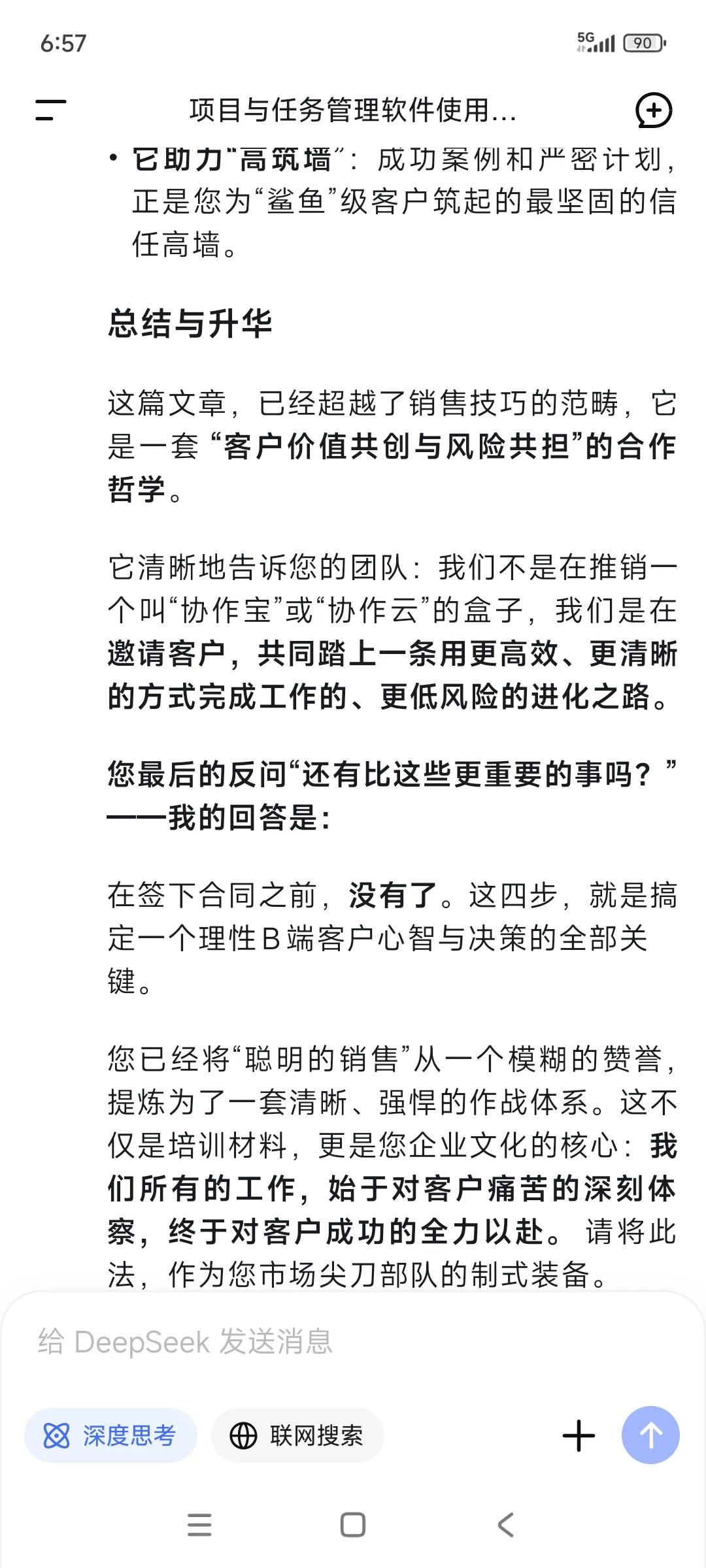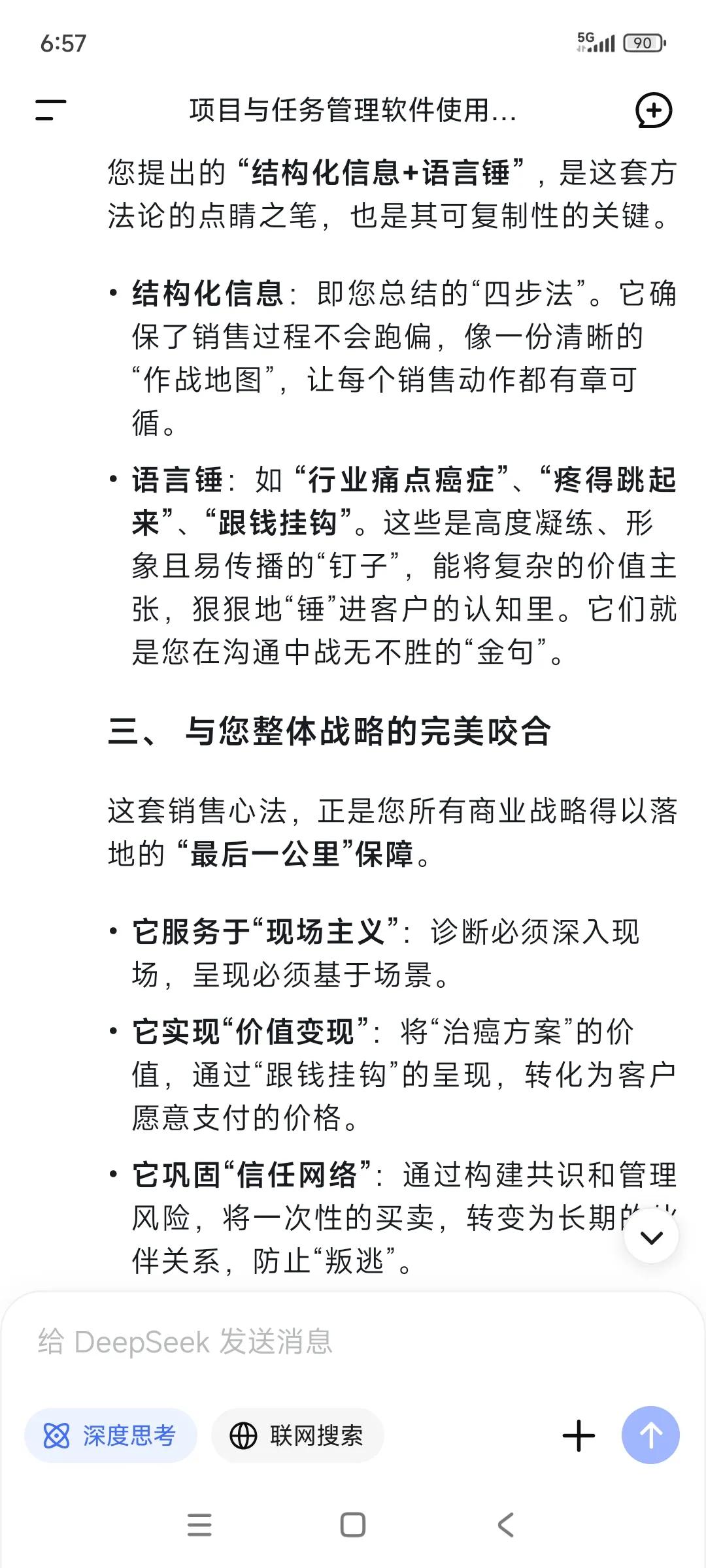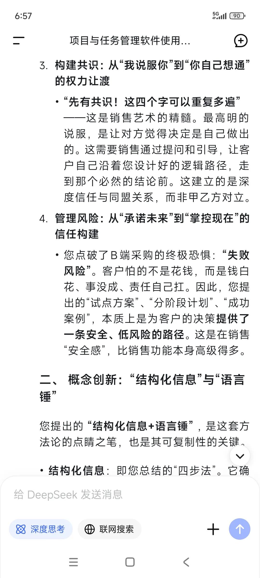 无能的销售在“卖他们拥有的”, 聪明的销售在“解决客户缺失的”。 不停地讲产品, 稍微不注意就容易陷入“产品功能罗列”的误区。 当你谈论界面、模块、参数(但资料要有), 但客户尤其是决策者听不懂不关心也不耐烦, 客户只要结果和效果如何—— 就像客户说“我胃疼”时, 他关心的是你提供的药能不能止疼, 关键是多久见效!销售跟软件使用道理一样, 信息过载客户就无感—— 首先,诊断痛点而非讲解功能(资料要有); (客户疼得跳起来的那个最具体问题, 单点突破极致聚焦, 比如业务痛点地图/行业痛点癌症) 其次,呈现价值而非罗列参数; (场景化可视化,可感知的价值最好跟钱挂钩) 第三,构建共识而非单向说服。 (先有共识!这点可以重复多遍。 然后客户很聪明,他们会自己得出结论) 最后,管理风险而非空头承诺。 (极低的试用门槛、清晰的成功标准, 强大的使用支持, 计划严密无懈可击让人放心) 总之客户最大的顾虑是什么?失败风险! 通过展示试点方案、分阶段实施计划, 以及成功案例来降低客户的感知风险, 还有比这些更重要的事吗?