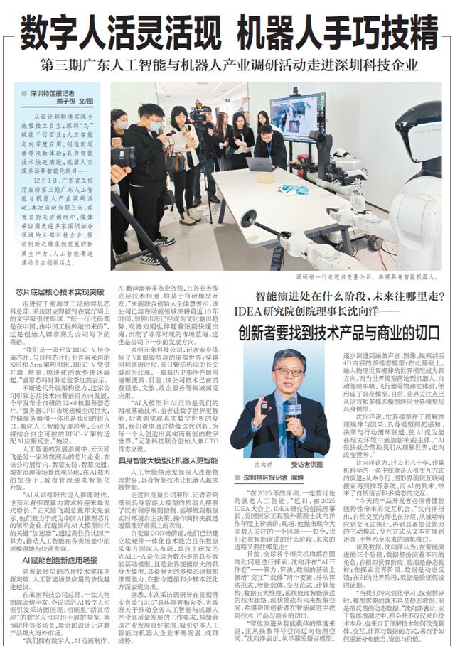 12月1日,广东省工信厅启动第三期广东人工智能与机器人产业调研活动。本次活动为期三天,在首日的采访调研中,媒体采访团走进多家深圳细分领域的头部科技企业,探访创新之城蓬勃发展的新质生产力,人工智能赛道涌动自主创新活力。
