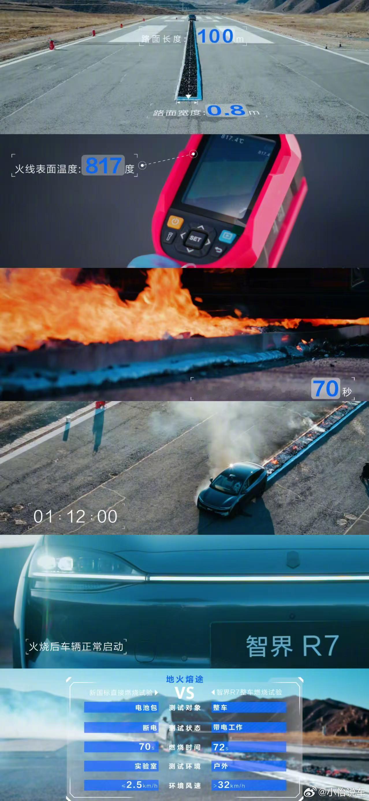 智界R7十万公里电池安全挑战智界R7十万公里电池测试的内容,说实话还挺让我意外的! 之前总担心电动车电池用久了衰减快,结果它跑十万公里电池健康度还能剩97%,这也太抗造了吧?还有那个火焰测试,顶着800℃高温开了72秒都没事,比国标要求还超了2秒,感觉真遇到点极端情况也能稳得住。 最戳我的是那个针刺实验,以前总怕电池被扎了会着火,结果它就光冒烟没明火,还能自动弹车门、开双闪提醒,这反应速度是真把安全给想到实处了。 说真的,现在买电车最纠结的就是电池安全,智界这波测试没搞那些虚头巴脑的,全是实打实的极端场景,看完是真觉得踏实多了,安全感这块是真给拉满了