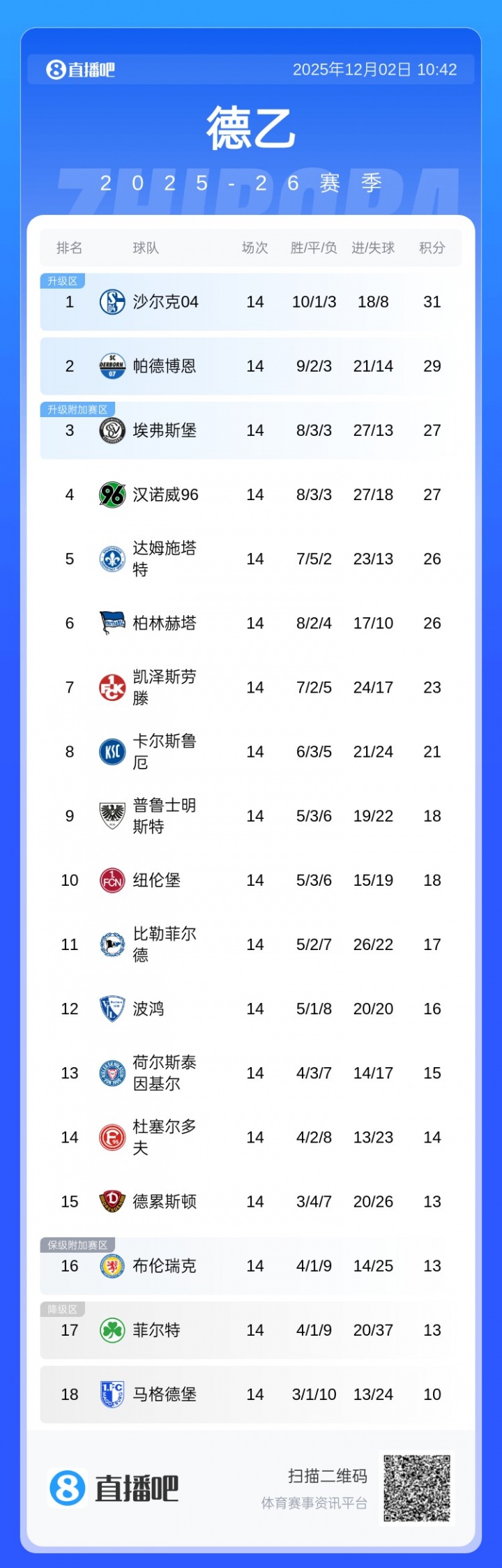 直播吧12月02日讯在周末的德乙联赛中,沙尔克04凭借拉斯米在第86分钟绝杀,2-1逆转战胜帕德博恩,从而反超对手升至积分榜榜首。
